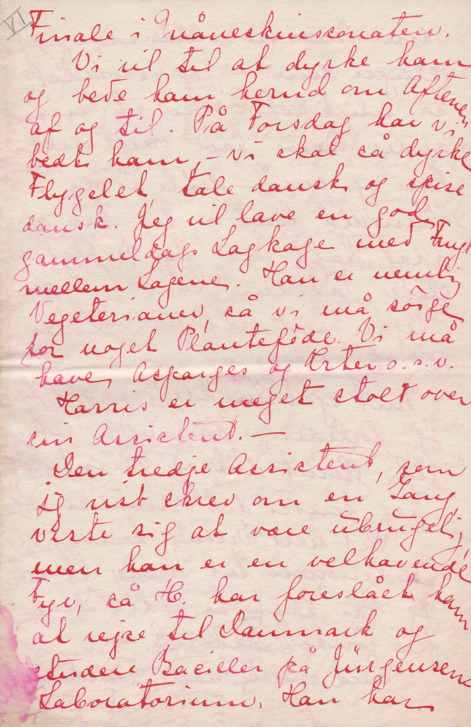Vi vil til at dyrke ham og bede ham herud om Aftenen af og til. På Torsdag har vi bedt ham, - vi skal så dyrke Flygelet tale dansk og spise dansk. Jeg vil lave en god gammeldags Lagkage med Frugt mellem Lagene. Han er nemlig Vegetarianer, så vi må sørge for noget Planteføde. Vi må have Asparges og Ærter o.s.v. Harris er meget stolt over sin Assistent.