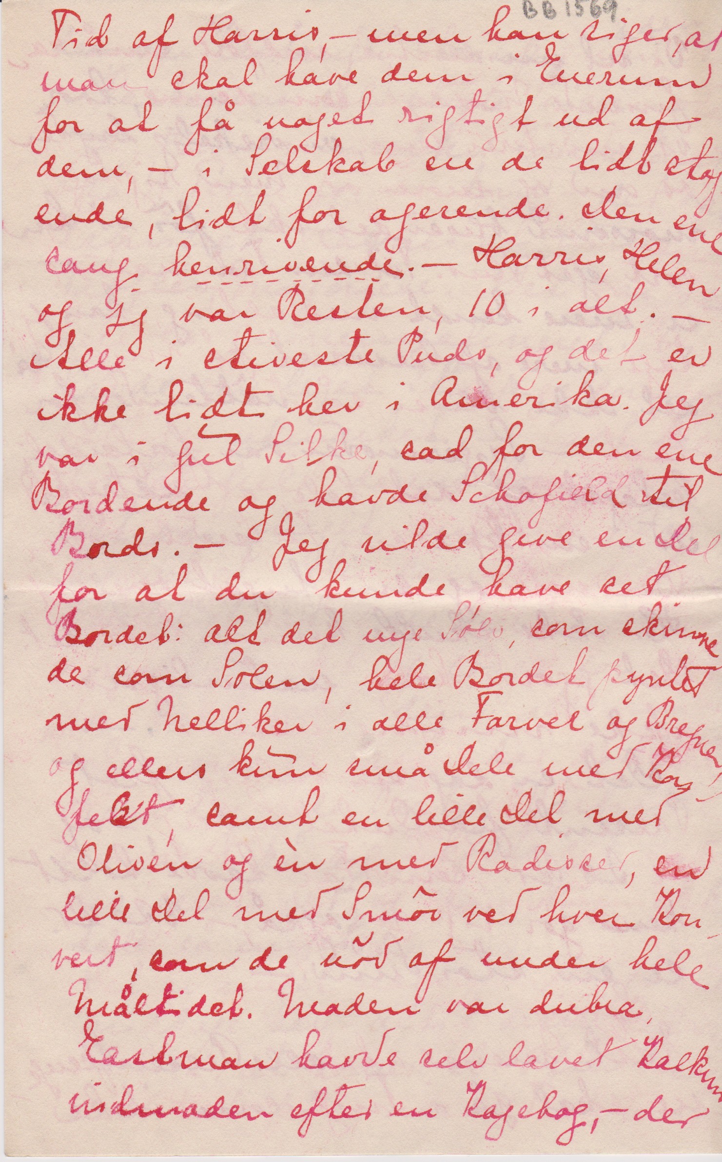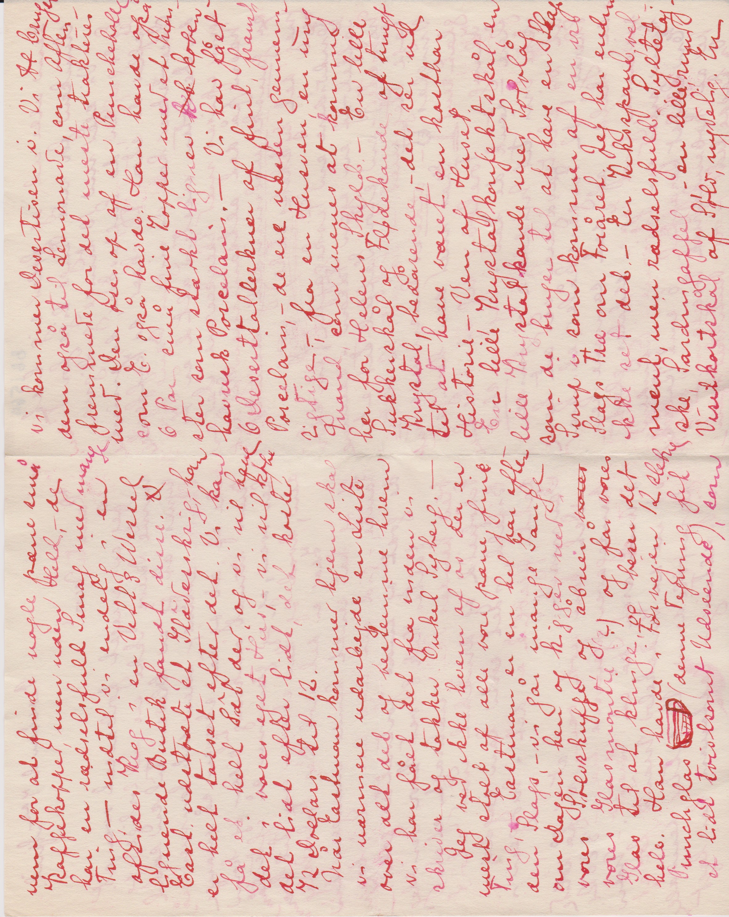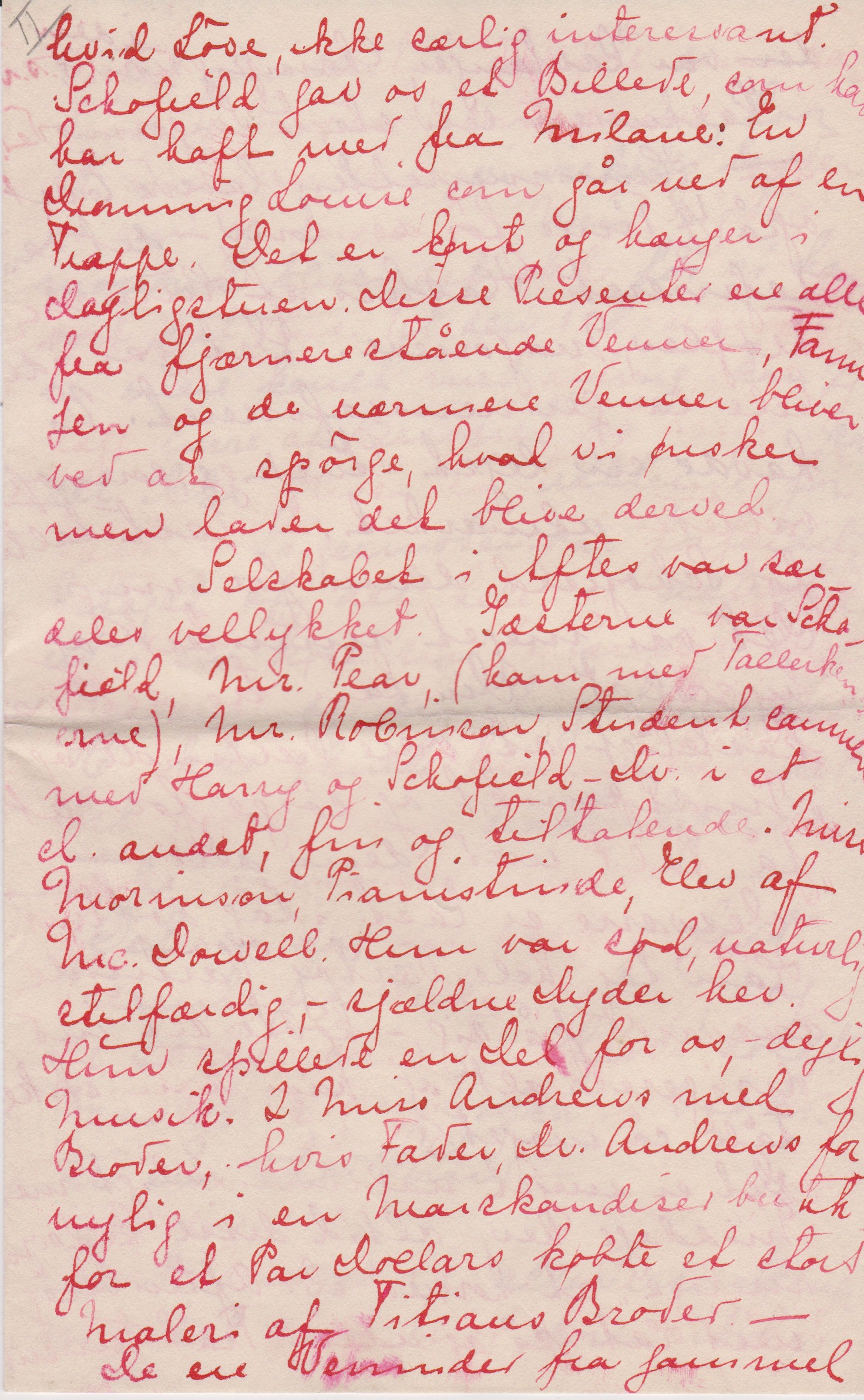 Jeg er meget forbavset over, at mine Breve ikke ere udførlige, (- jeg synes, at jeg er bleven til en sand Skrivemaskine) – men det kommer måske af at jeg har skreven så mange Breve rundt omkring til [”til” indsat over linjen] siden jeg kom her over, og jeg glemmer så efterhånden, hvad jeg har skreven om til hvem.