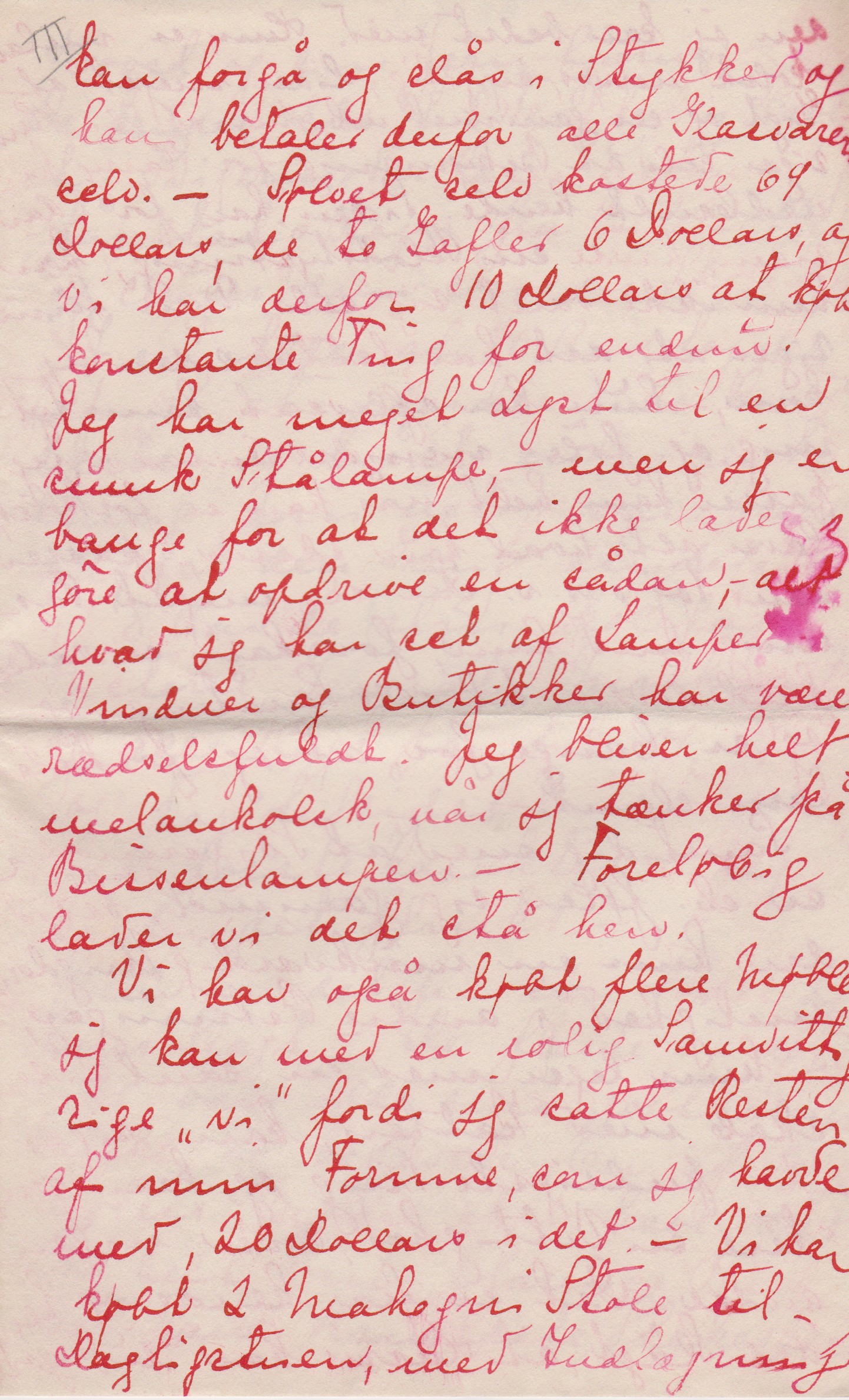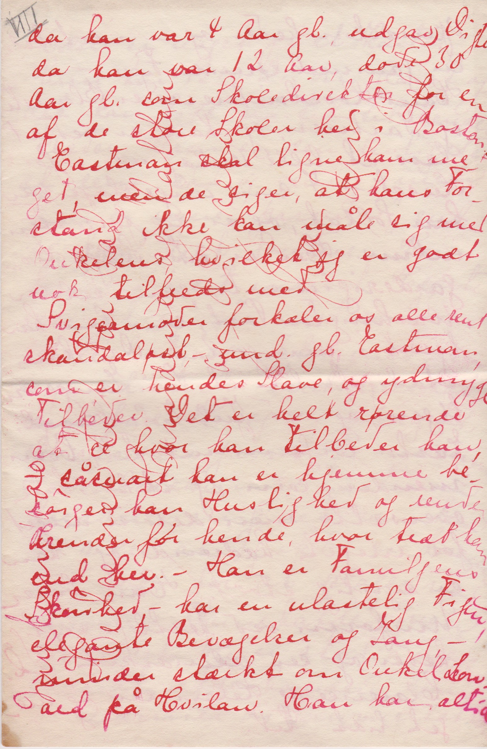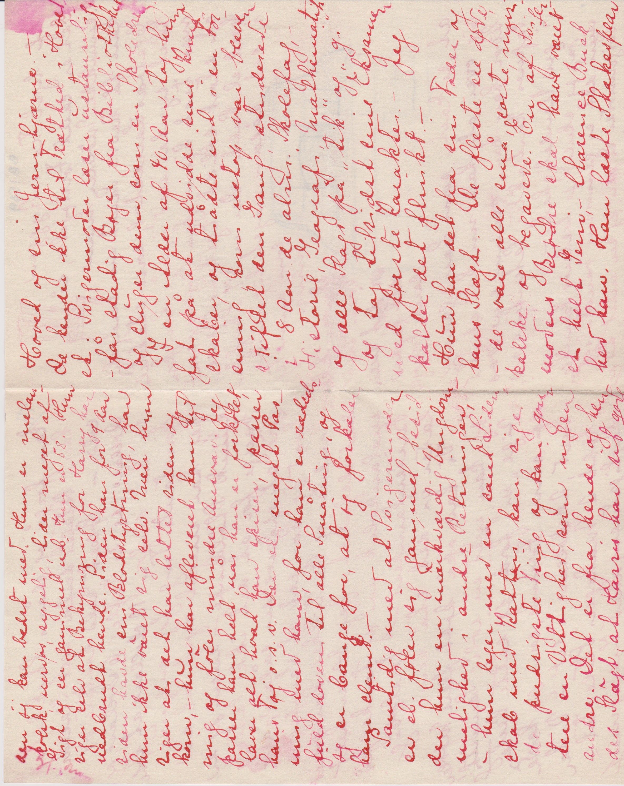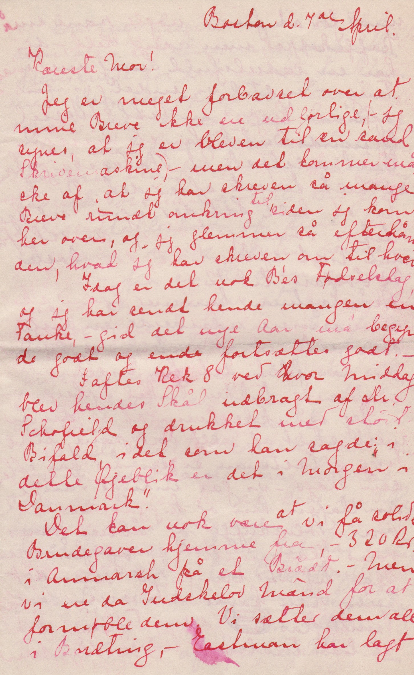Jeg er meget forbavset over, at mine Breve ikke ere udførlige, (- jeg synes, at jeg er bleven til en sand Skrivemaskine) – men det kommer måske af at jeg har skreven så mange Breve rundt omkring til [”til” indsat over linjen] siden jeg kom her over, og jeg glemmer så efterhånden, hvad jeg har skreven om til hvem.