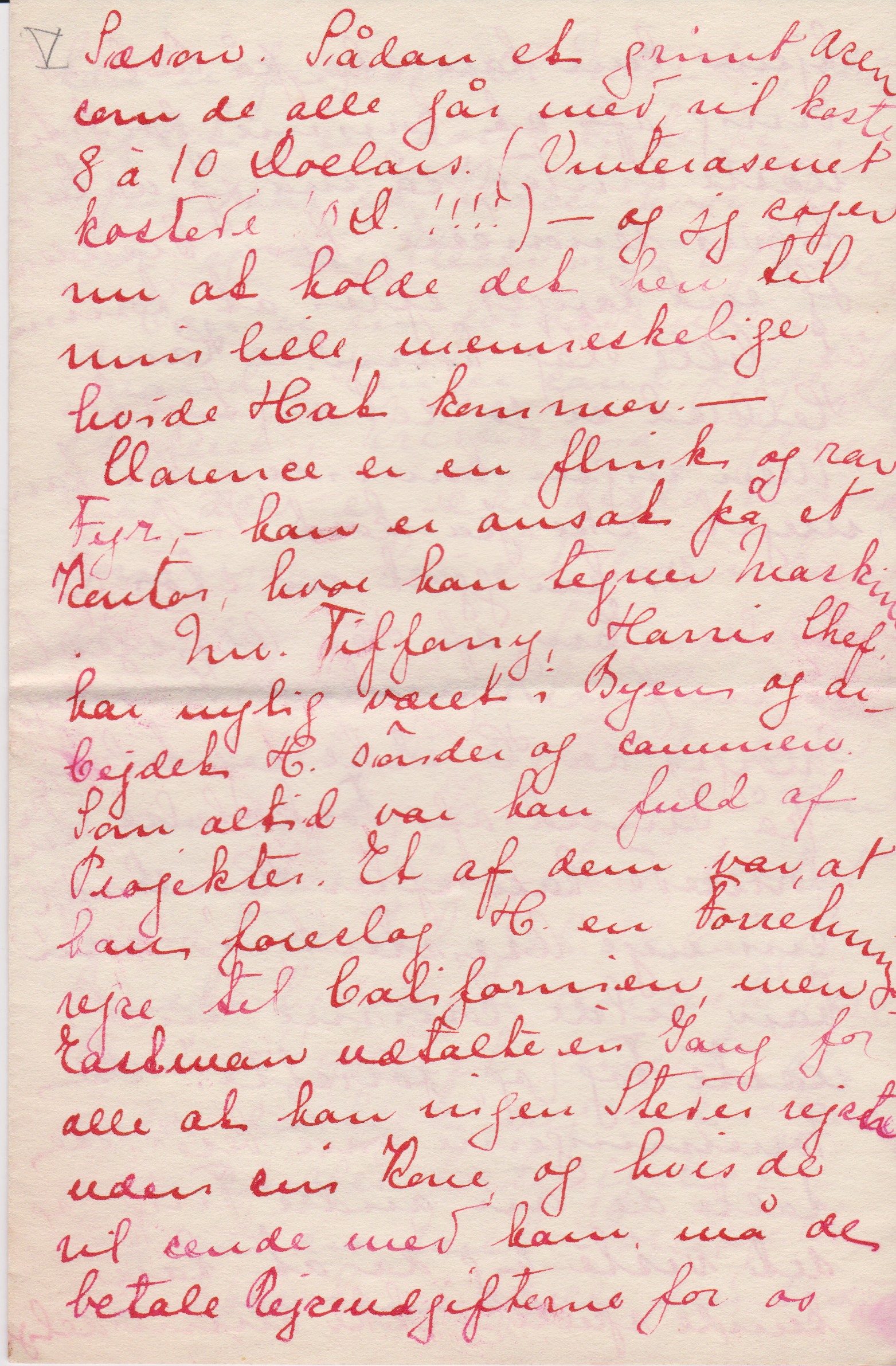 Mr. Tiffany, Harris’ Chef, har nylig været i Byen og arbejder H. sønder og sammen. Som altid var han fuld af Projekter. Et af dem var, at han foreslog Harris en Forretningsrejse til Californien, men Eastman udtalte èn Gang for alle at han ingen Steder rejste uden sin Kone og hvis de vil sende med ham, må de betale Rejseudgifterne for os begge. - Beskeden er Eastman ikke:
