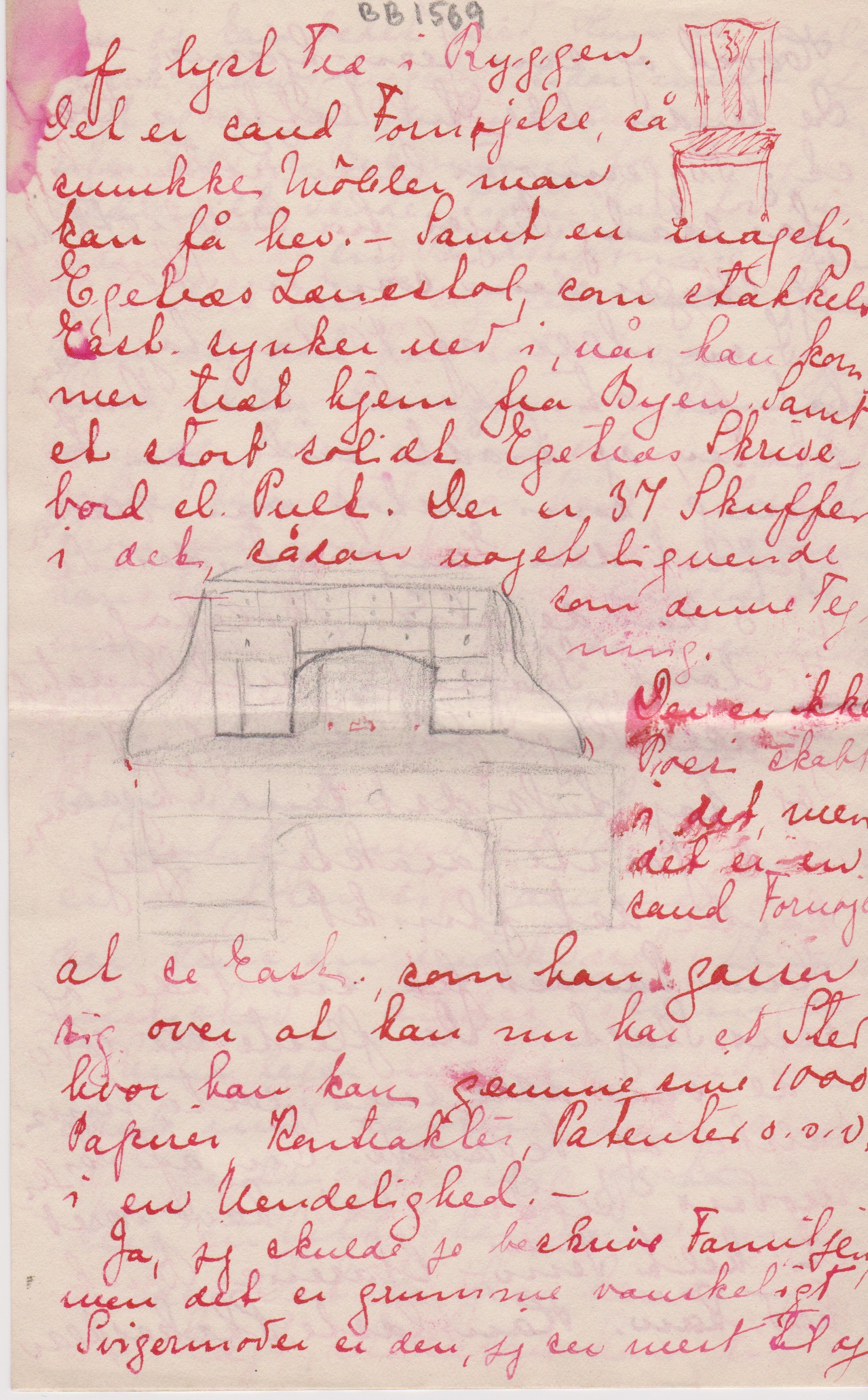 Vi har også købt flere Møbler, jeg kan med en rolig Samvittighed sige ”vi” fordi jeg satte Resten af min Formue, som jeg havde med, 20 Dollars i det. – Vi har købt 2 Mahogni Stole til – Dagligstuen, med Indlægning af lyst Træ i Ryggen. [Tegning] Det er sand Fornøjelse, så smukke Møbler man kan få her. – Samt en magelig Egetræs Lænestol, som stakkels East. synker ned i, når han kommer træt hjem fra Byen. Samt et stort solidt Egetræs Skrivebord el. Pult. Der er 37 Skuffer i det, sådan noget lignende som denne Tegning. [Tegning]. Der er ikke Poesi skabt i det, men det er en sand Fornøjelse at se East., som han gasser sig over at han nu har et Sted hvor han kan gemme sine 1000 Papirer, Kontrakter, Patenter o.s.v. i en Uendelighed.