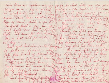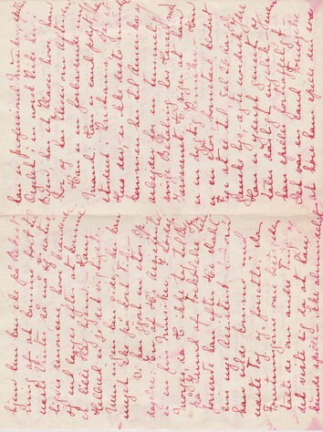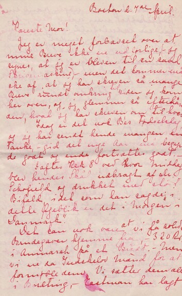 Du kan ikke tænke dig, hvor dine Breve ere velkomne, - jeg sluger dem. – Jeg er virkelig ulykkelig over at mine andre Breve have været indholdsløse og små – dette er da til Gengæld fedt. – Jeg har også idag haft Brev fra B., Dis og Dede. Tak dem på det hjærteligste. Jeg er helt vild på sådan en Dag. –