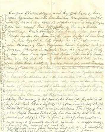 Tusind Tak for dit sidste Brev, der jo ikke, som du selv bemærkede, var slet saa glansfuldt som alle dine senere Breve ellers har været. Tobaksmissèren er jo ret alvorlig, hvis du ikke kan vænne dig til Piben; mon ikke det vilde hjælpe, hvis du fik en lidt større Pibe, de bittesmaa er vist ikke saa gode at ryge af, og saa skulde du jo gerne finde noget meget mild Tobak, den – synes jeg – bider ikke saa meget paa Tungen som den fine Tobak, der næsten altid tillige er stærk. Jeg forstaar saa godt, at Savnet af Tobakshyggen maaske bliver det værste at undvære. - - Du tog lidt for tungt paa, at du ikke havde takket for Julebrevene – skidt med det, men du forstaar, jeg vilde bare vide, om du havde faaet dem. - - At I har ondt ved at faa Pengene til at slaa til, er sandelig ikke underligt, gid I maa kunne klare det!