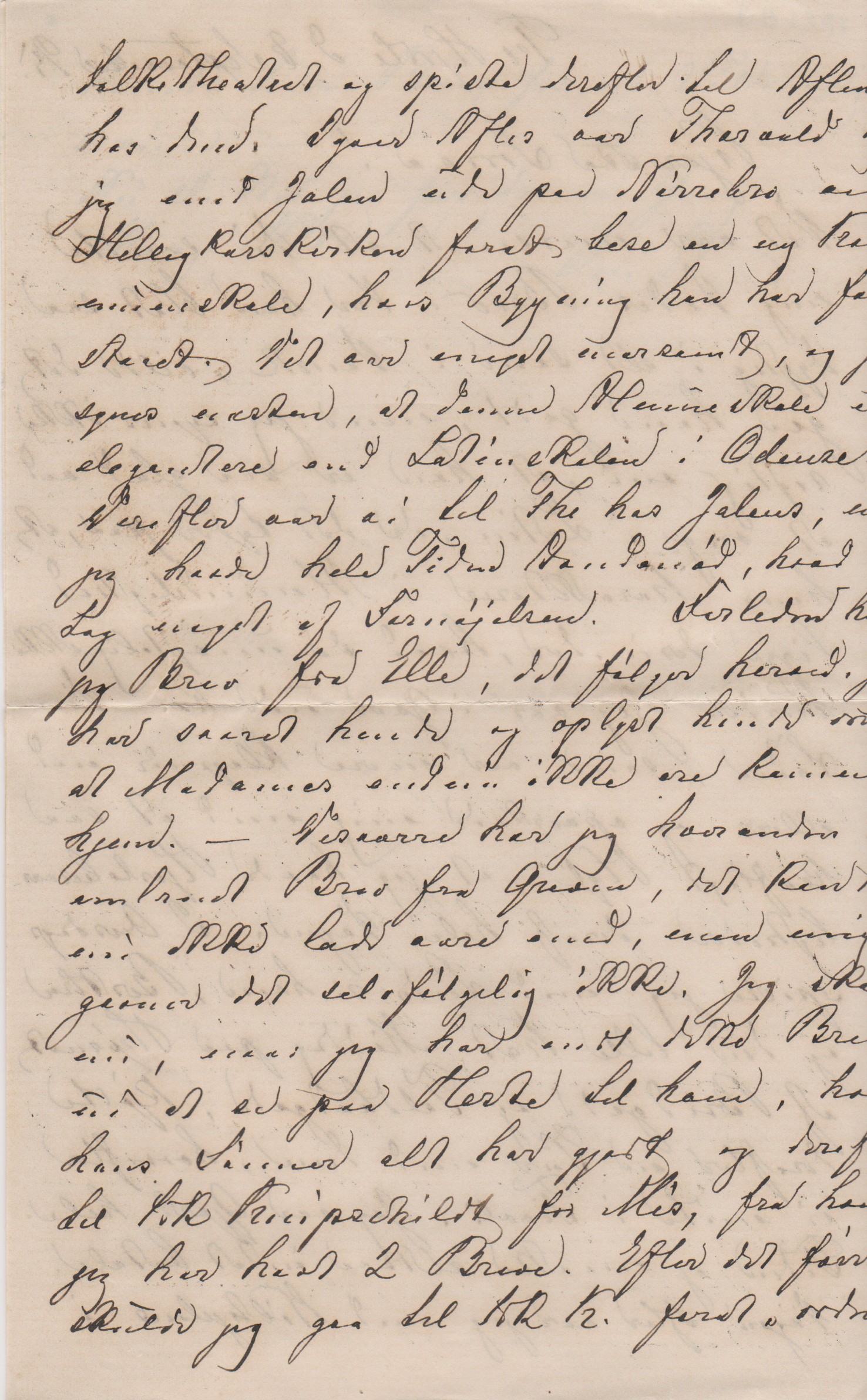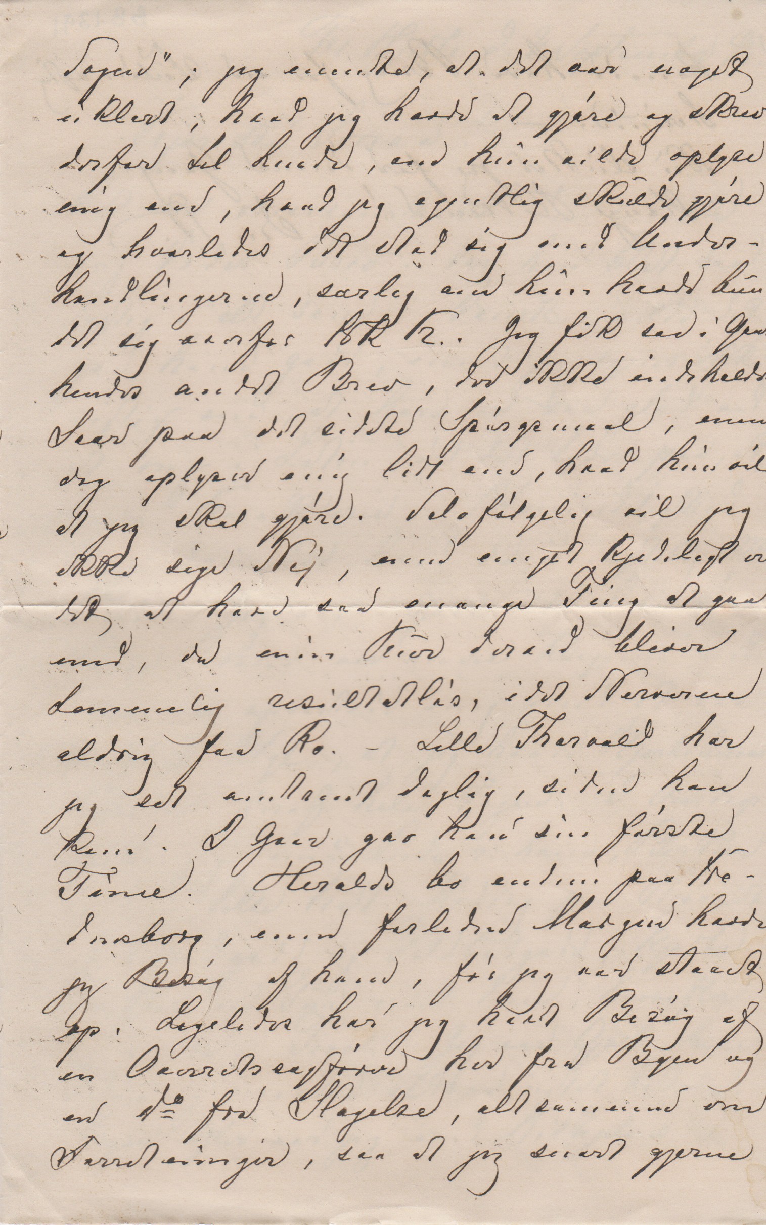 Det var morsomt at Du sendte mig Dedes Brev. Var han blot saa dygtig i alt som i Dansk, vilde det gaa ham godt, men jeg synes ikke rigtig om, at han er saa glad ved et mg i Latin, da det tyder paa, at hans Karakterer i Almindelighed ligger derunder, han er unægtelig ikke [ulæselig]. Jeg var i Gaar ud hos din Søster, som var mere klagende end ellers og [ulæseligt ord] mig med et saa kraftigt Hyl, at jeg havde Hjertebesværligheder deraf hele Dagen. I Onsdags spiste jeg [ulæseligt ord] hos Luds, Bertha og den lille [ulæseligt] Middag paa Hjørnet af Bredgade og Toldbodgade, kjørte derefter en Tur med dem, hvorefter vi endte i Tivoli. Jeg var Gæst hele Tiden og maatte altsaa intet betale. Dagen efter var jeg med Vilhjelmine i Folketeatret og spiste derefter til Aften hos hende. Igaar Aftes var Thorvald og jeg samt [ulæseligt ord] ude paa Nørrebro ved Hellig Kors Kirken forat bese en ny Kommuneskole, hvis Bygning han har forestaaet. Det var meget morsomt, og jeg synes næsten, at denne Almueskole er elegantere end Latinskolen i Odense. Herefter var vi til The hos [ulæseligt ord], men jeg havde hele Tiden [ulæseligt ord], hvad der tog noget af Fornøjelsen. Forleden havde jeg Brev fra Elle, det følger hermed. Jeg har svaret hende og oplyst hende om, at Madames endnu ikke er kommen hjem. – Desværre har jeg næsten hveranden Dag omtrent Brev fra Greven, det kan han nu ikke lade være med, men mig generer det selvfølgelig ikke. Jeg skal nu, naar jeg har sendt dette Brev, ud at se paa Heste til ham, hvad hans Sønner alt har gjort og derefter til Frk Knipschildt for Mis, fra hende jeg har havt 2 Breve. Efter det første skulde jeg gaa til Frk K. for at ”ordne Sagen”; jeg mente, at det var noget uklart, hvad jeg havde at gjøre og skrev derfor til hende, om hun vilde oplyse mig om, hvad jeg egentlig skulde gjøre og hvorledes det stod sig med Underhandlingerne, særlig om hun havde dummet sig over for Frk K. Jeg fik saa i Gaar hendes andet Brev, der ikke indeholdt Svar paa det sidste Spørgsmaal, men dog oplyser mig lidt om, hvad hun vil, at jeg skal gøre. Selvfølgelig vil jeg ikke sige Nej, men meget kjedeligt er det at have saa mange Ting at gaa med, da min Tid snart bliver temmelig usikker, idet Nerverne aldrig faa Ro. - Lille Thorvald har set omtrent daglig siden han kom! I Gaar gav han sin første Time. Harald bor endnu paa Fredensborg, men forleden Morgen havde jeg Besøg af ham, før jeg var staaet op. Ligeledes har jeg haft Besøg af en Overretssagfører her fra Byen og en d_o_ fra Slagelse, altsammen om Forretninger, saa at jeg snart gjerne kunde have Brug for en Fuldmægtig herinde. –