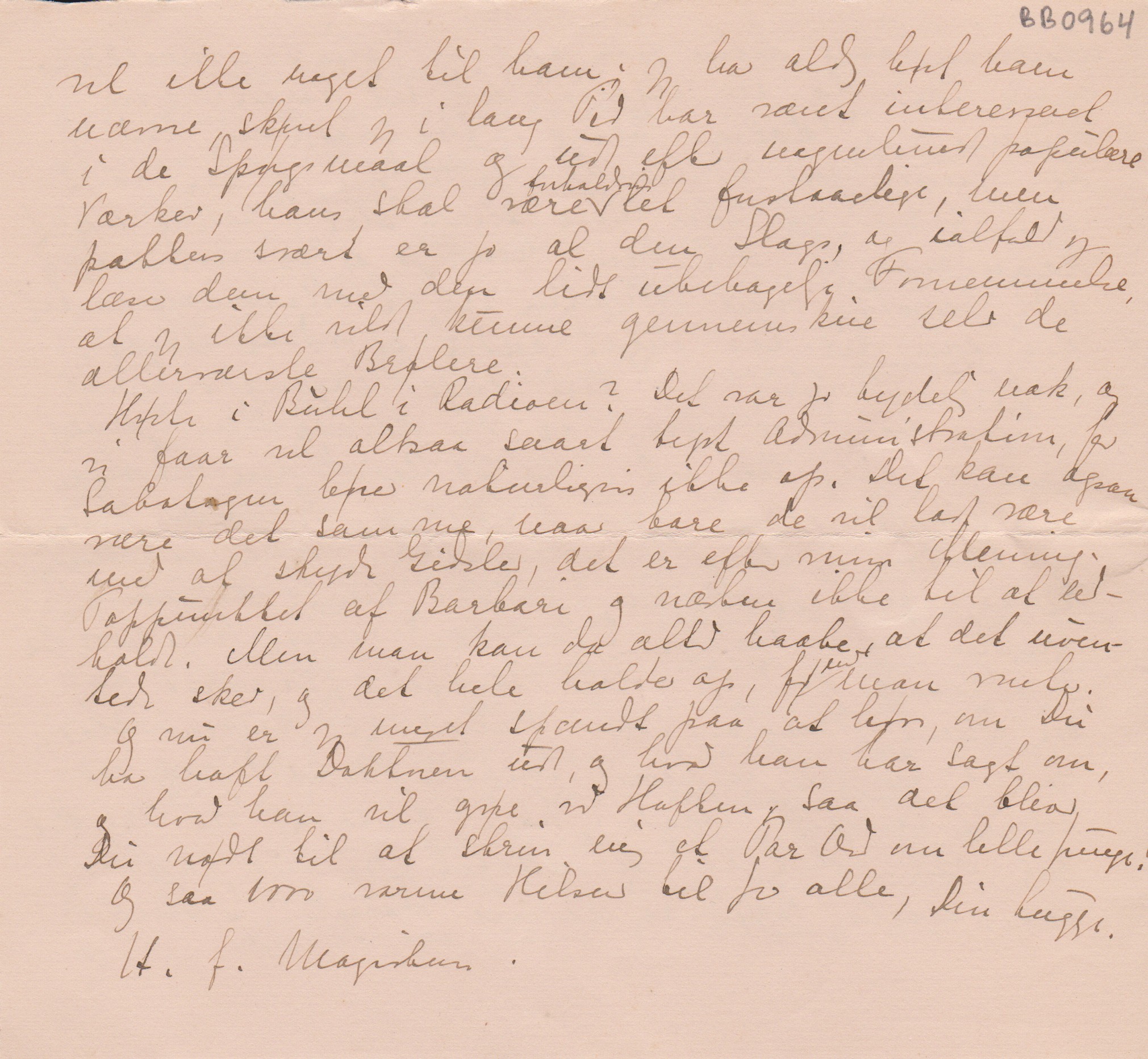 Hørte I Buhl i Radioen? Det var jo tydelig nok, og vi faar vel altsaa snart tysk Administration, for Sabotagen hører naturligvis ikke op. Det kan ogsaa være det samme, naar bare de vil lade være med at skyde Gidsler, det er efter min Mening Topmaalet af Barbari og næsten ikke til at udholde. Men man kan da altid haabe, at det uventede sker, og det hele holder op, før end ["end" indsat over linjen] man venter.