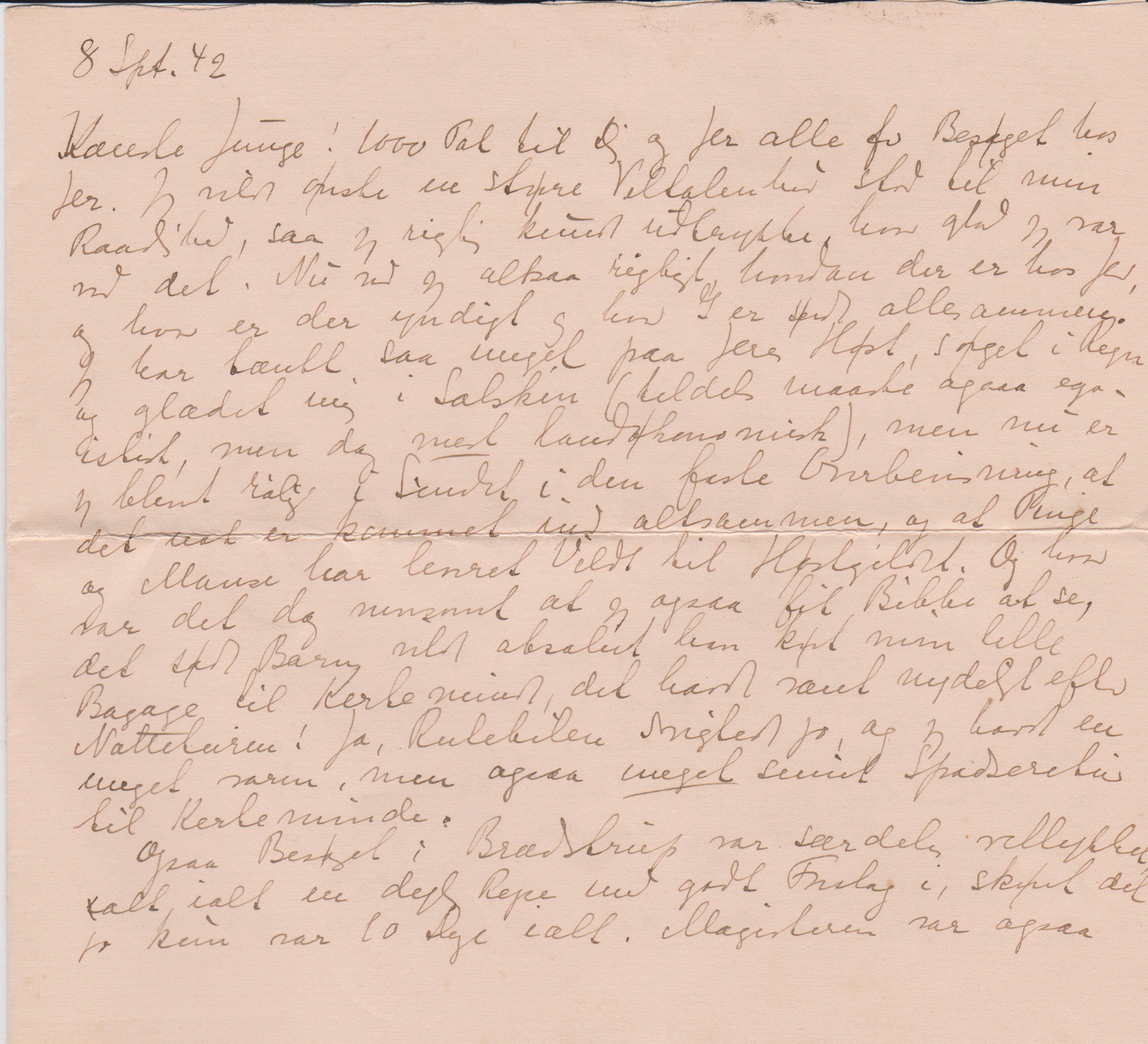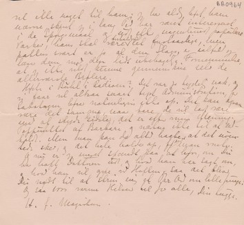 Kæreste Junge! 1000 Tak til Dig og Jer alle for Besøget hos Jer. Jeg vilde ønske en større Veltalenhed stod til min Raadighed, saa jeg rigtig kunde udtrykke, hvor glad jeg var ved det. Nu ved jeg altsaa rigtigt, hvordan der er hos Jer, og hvor er der yndigt og hvor I er søde allesammen. Jeg har tænkt saa meget paa Jeres Høst, sørget i Regn og glædet mig i Solskin (tildels maaske ogsaa egoistisk, men dog mest landøkonomisk), men nu er jeg blevet rolig i Sindet i den faste Overbevisning, at det nok er kommet ind altsammen, og at Tinge og Manse har leveret Vildt til Høstgildet. Og hvor var det dog morsomt at jeg ogsaa fik Bibbe at se, det søde Barn vilde absolut have kørt min lille Bagage til Kerteminde, det havde været nydeligt efter Natteturen! Ja, Rutebilen svigtede jo, og jeg havde en meget varm, men ogsaa meget sund Spadseretur til Kerteminde.