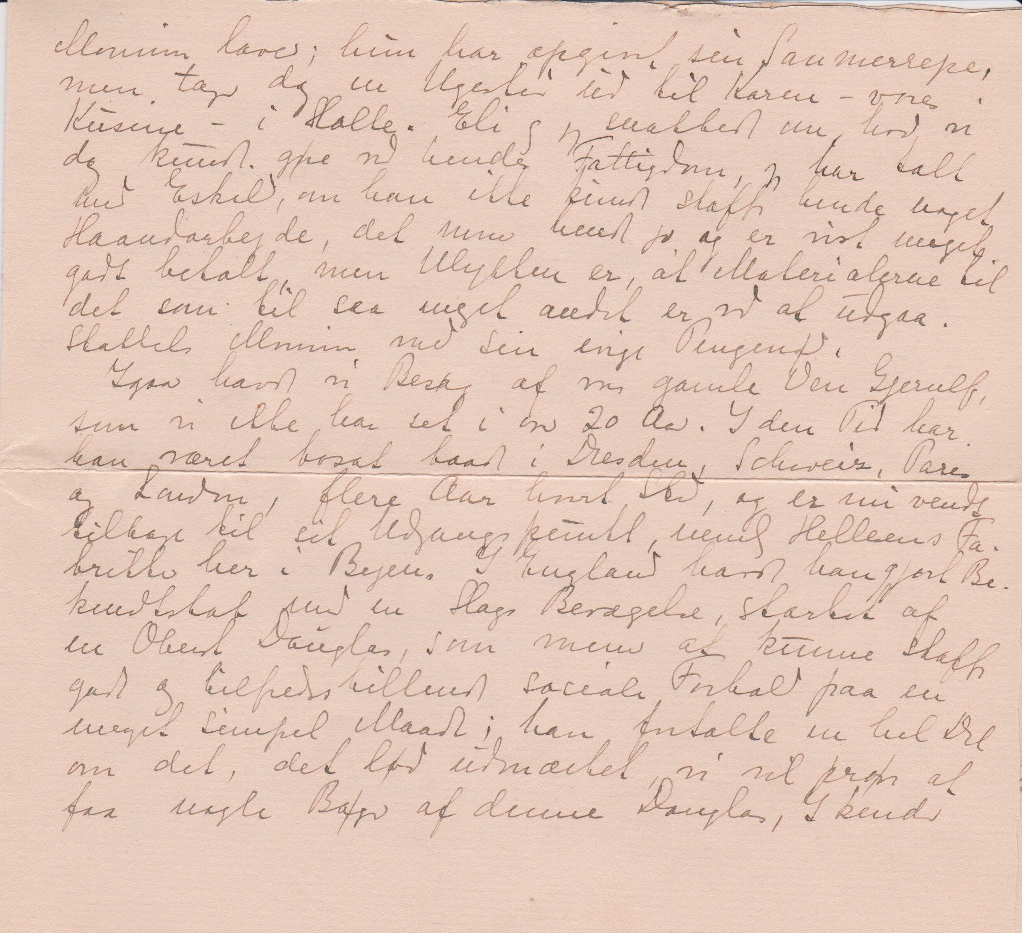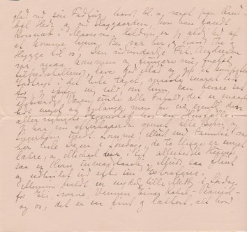 Igaar havde vi Besøg af vor gamle Ven Gjerulf, som vi ikke har set i en 20 Aar. I den Tid har han været bosat baade i Dresden, Schweiz, Paris og London, flere Aar hvert Sted og er nu vendt tilbage til sit Udgangspunkt, nemlig Hellesens Fabrikker her i Byen. I England havde han gjort Bekendtskab med en Slags Bevægelse, startet af en Oberst Douglas, som menes at kunne skaffe gode og tilfredsstillende sociale forhold paa en meget simpel Maade; han fortalte en hel Del om det, det lød udmærket, vi vil prøve at faa nogle Bøger af denne Douglas, I kender vel ikke noget til ham; jeg har aldrig hørt ham nævne, skønt jeg i lang Tid har været interesseret i de Spørgsmål og ude efter nogenlunde populære Værker, han skal være forholdsvis [”forholdsvis” indsat over linien] let forstaaelig, men pokkers svært er jo al den Slags, og ialfald jeg læser dem med den lidt ubehagelige Fornemmelse, at jeg ikke vilde kunne gennemskue selv de allerværste Brølere.