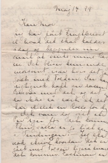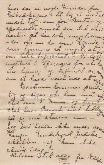 Jeg har fået Fragtbrevet eller hvad det skal kaldes i Dag og begynder nu snart at vente mine Kasser. Det bliver knusende morsomt, - især hvis det går godt med Tolden. Du har rigtignok haft en rasende Besvær med det og det er ikke så sært at det har spillet en Rolle for dig. Det varer dog vist et Par Uger før det kommer. Thingvalla er jo lidt sen i Vendingen. Jeg skal nok skrive hvordan det er gået med Tolden ligeså snart det kommer. Eastman er knap så begejstret som jeg ved Tanken om at det nærmer sig. – Du skal ikke bekymre dig om at sende det Sengetæppe. Måske Mr. Pray vil tage det med, når han rejser hjem om tre Måneder.
