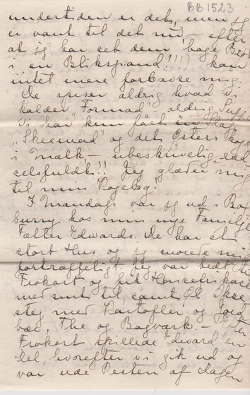 I Mandags var jeg ude i Boxburry hos min nye Familie, Fætter Edwards. De har et stort Hus og jeg morede mig fortræffeligt. Jeg var bedt til Frokost og fik Hønsefrikasé med surt til, samt Øl, Oksesteg med Kartofler og Jordbær, The og Bagværk. – Efter Frokost spillede Edward en Del, hvorefter vi gik ud og var ude Resten af Dagen. Vi er Edward, Bel, Konen (jeg kender ikke hendes rigtige Navn) og deres store Hund. De har en Hønsegård og en Hane. Vi lå i Græsset og solede os og gik derefter ud for at plukke vilde Blomster, så jeg havde en hel Stak med mig hjem.