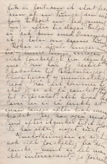 Husholdningen er rigtig nok vidt forskellig fra den danske, - nemt er det men ikke interessant, - jo forresten undertiden er den, men jeg er vant til det nu, - efter at jeg har set dem bage Brød i en Blikspand (!!!) kan intet mere forbavse mig. De spiser aldrig hvad vi kalder ”Formad” – aldrig Suppe. Vi har kun fået en Slags ”Skemad” og det Østers kogt i Mælk, - ubeskrivelig rædselsfuldt!! Jeg glæder mig til min Kogebog!