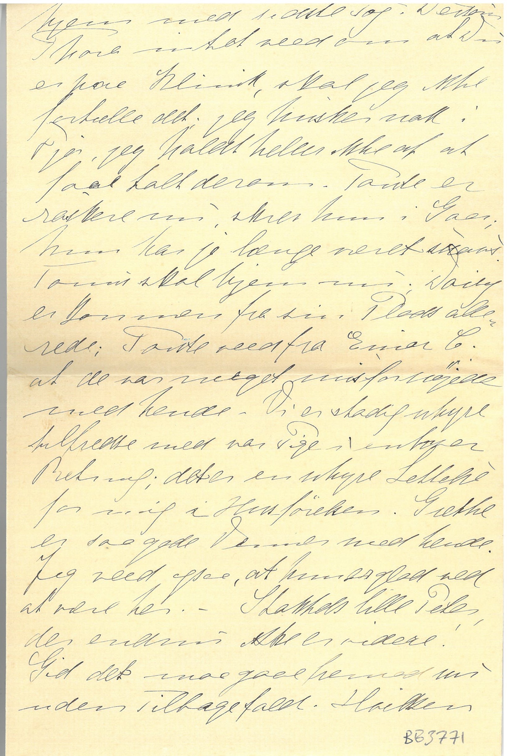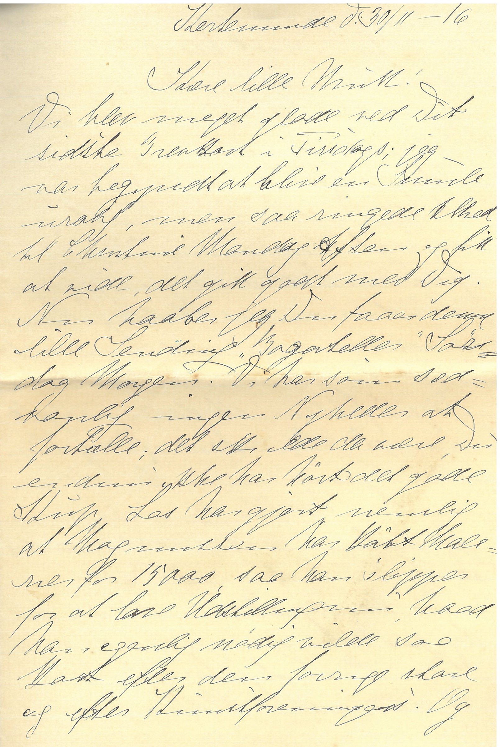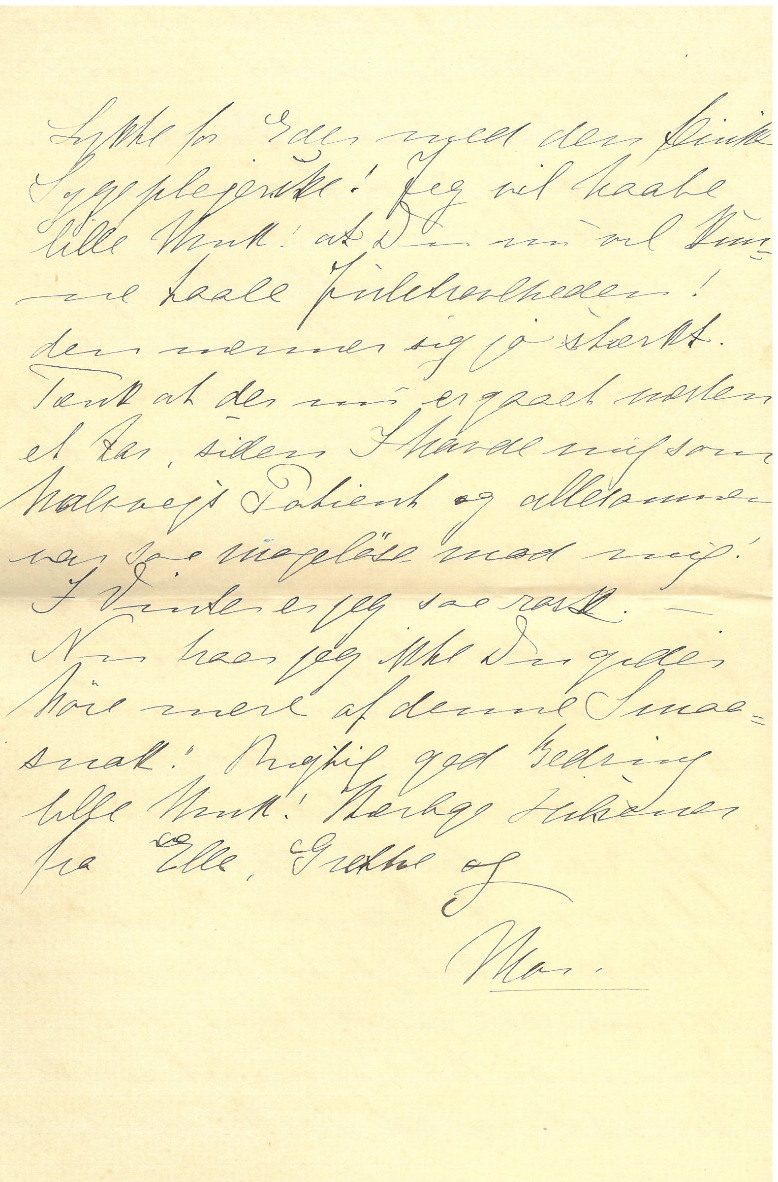 Vi blev meget glade ved Dit sidste Brevkort i Tirsdags; jeg var begyndt at blive en Smule urolig, men saa ringede Alhed og Christine Mandag Aften og fik at vide, det gik godt med Dig. Nu haaber jeg Du faaer denne lille Sending "Bagateller" Søndag Morgen. Vi har som sædvanlig ingen Nyheder at fortælle; det skulde da være, Du endnu ikke har hørt det gode Kup Las har gjort nemlig at Magnussen har købt Malerier for 15000, saa han slipper for at lave Udstillingen, hvad han egentlig nødig vilde saa kort efter den forrige store og efter Kunstforeningens! Og der blev heldigvis en hel Del tilbage, som kan være Grundlag for en Udstilling ad Aare. Af Båxhult Billederne blev de bedste tilbage. Alhed selv solgte for 300. Magnussen var der 4 Dage; det er en elskværdig Mand; de var her med ham til en 5 The, og han saae hele Huset. - I Brædstrup staaer alt saare godt til, veed jeg dels pr. Brev og dels pr. Telefon. Minna nyder i fulde Drag sin Barselseng; bliver overlæsset med Gaver af alle Slags; Ørenringe med Diamanter til 500!! ["til 500!!" indsat over linjen] af sin Broder Frits; en Bankbog med 100 Kr. af Dede samt en magelig Lænestol. De har faaet ny Pige til Nobr; Line sagde op, da det viste sig at der skulde komme en Baby igen!! men den nye er "en Engel", siger Dede, og nu har de ogsaa Barnepige, saa de kan nok klare sig, mener han! - Sygeplejersken er uhyre rar og flink. Paa Fredag skal Minna op. Drengen "siger aldrig et Muk"! - Jeg citerer stadig Dede! Han venter "en meget stor Termin" - men paa en lidt anden Facon end vi andre Stakler! Hans giver dem en god Indtægt? Tænk han vil komme her et Par Dage i Julen! det glæder vi os alle meget til; enten efter Julen eller Nytaar. De venter hele Familien fra Kbh der nogle Dage; jeg antager, de skal have Barnedaab og at Fru Kattrup skal bære. - Paa Mandag skal vi alle til Middag paa Risinge og jeg havde den Sorg i Gaar, at de tør ikke have Agrarens med for Mæslingerne; Johanne var saa grulig skuffet; havde lige en Timestid at glæde sig og fik gjort Aftale med Alhed om at laane Kjole hos hende! Men saa gav det sig, at Peter havde fraraadet Kattrups dem! Saa sjelden de bliver bedt til noget og at Johanne glædede sig dertil. Berthelsens skulde der og Bichels. - Nu er lille Conrad ogsaa syg, men endnu ret mildt; Bibbe oppe, Grethe endnu ikke smittet. - Vi har haft en festlig Dag med Elle hjemme. Hun har været et Par Smaature ude at male to Akvareller og derved tjent ca. til Julegaver. Der er bleven spurgt hos Madsen efter Billeder af hende, saa hun vil hænge i det hun kan inden Jul. Hun har nylig igen faaet Procenter af et Klaver; det 6_te_ i Aar!! - det ene et Flygel, et andet for nylig til 1300 (H. Meier.) Elle og Grethe har siddet derinde og spillet noget fin og kønt firhændigt og da jeg kom ind og skulde høre hvad det var, viste det sig at være Grethes Kompositioner lige ud af Hovedet og Elle ligesaadan Bassen dertil ! Jeg synes det er imponerende og det samme mener Elle og Johanne, som var her til Kaffe og hørte det. Nu er Eller gaaet hen paa Hotellet til Dahlerup, som var her en Visit, mens hun var ude; Grethe i Biografen, her er saa stille og naar dette Brev er færdigt, skal jeg have fat paa mit Maaneds Regnskab. I Morgen skal jeg til Odense, være sammen med Thora, som kommer Kl. 5, og saa til Kirkekoncert med Grethe Kl. 8 og hjem med sidste Tog. Dersom Thora intet veed om at Du er paa Klinik, skal jeg ikke fortælle det; jeg husker nok i Fjor, jeg holdt heller ikke af at faae talt derom. Tante er raskere nu, skrev hun i Gaar; hun har jo længe været snavs. Tonni skal hjem nu; Daisy er kommen fra sin Plads allerede; Tante veed fra Einar C. at de var meget misfornøjede med hende. Vi er stadig uhyre tilfredse med vor Pige i enhver Retning; det er en uhyre Lettelse for mig i Husførelsen. Grethe er saa gode Venner med hende. Jeg veed ogsaa, at hun er glad ved at være her. - Stakkels lille Peter, der endnu ikke er videre! Gid det maa gaae fremad nu uden Tilbagefald. Hvilken Lykke for Eder med den flinke Sygeplejerske! Jeg vil haabe lille Muk at Du nu vil kunne taale Juletravlheden! den nærmer sig jo stærkt. Tænk at der nu er gaaet næsten et Aar, siden I havde mig som halvvejes Patient og allesammen var saa mageløse mod mig! I Vinter er jeg saa rask. - Nu troer jeg ikke Du gider høre mere af denne Smaasnak! Rigtig god Bedring lille Muk! Kærlige Hilsener fra Elle, Grethe og