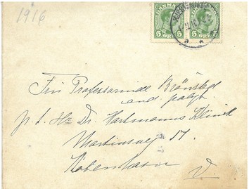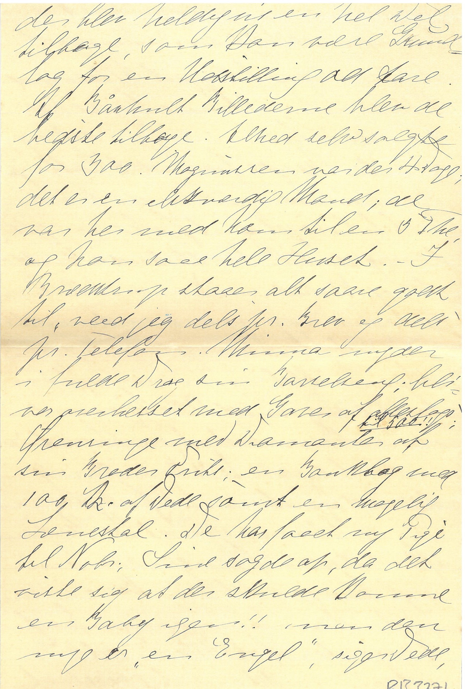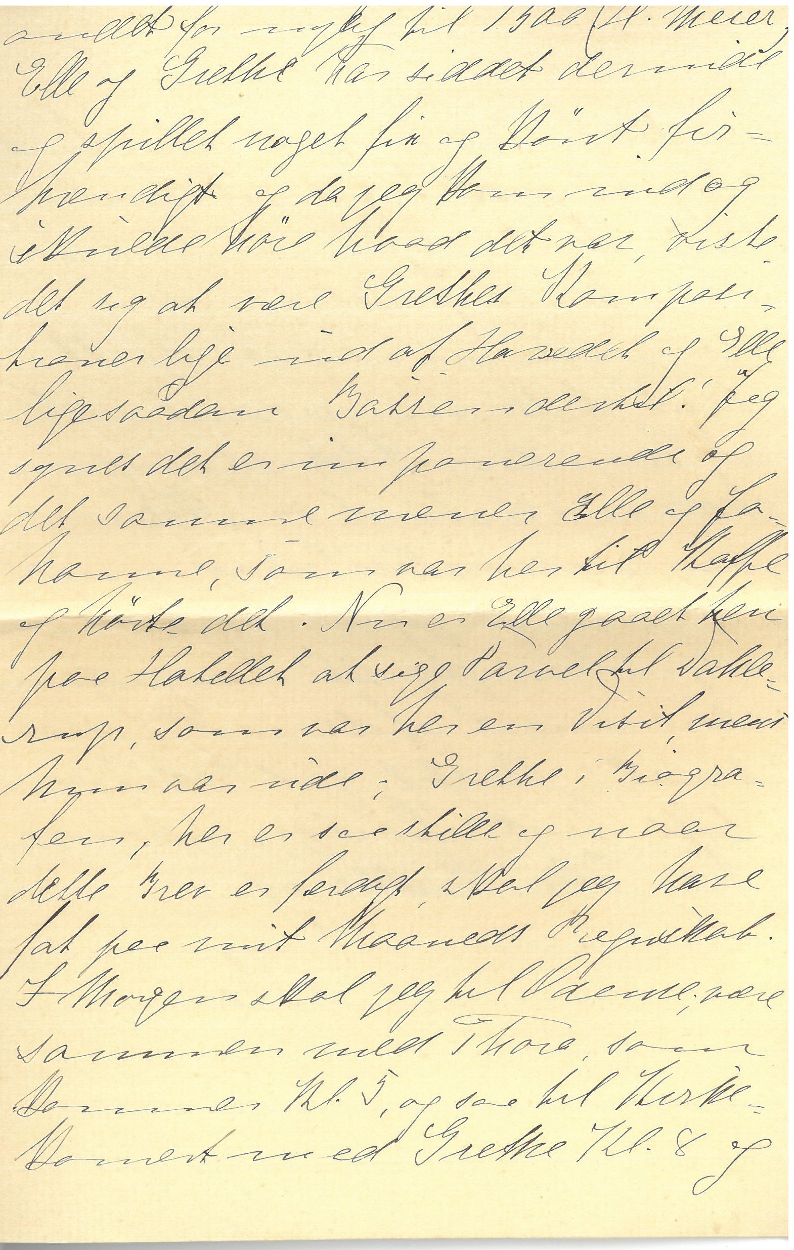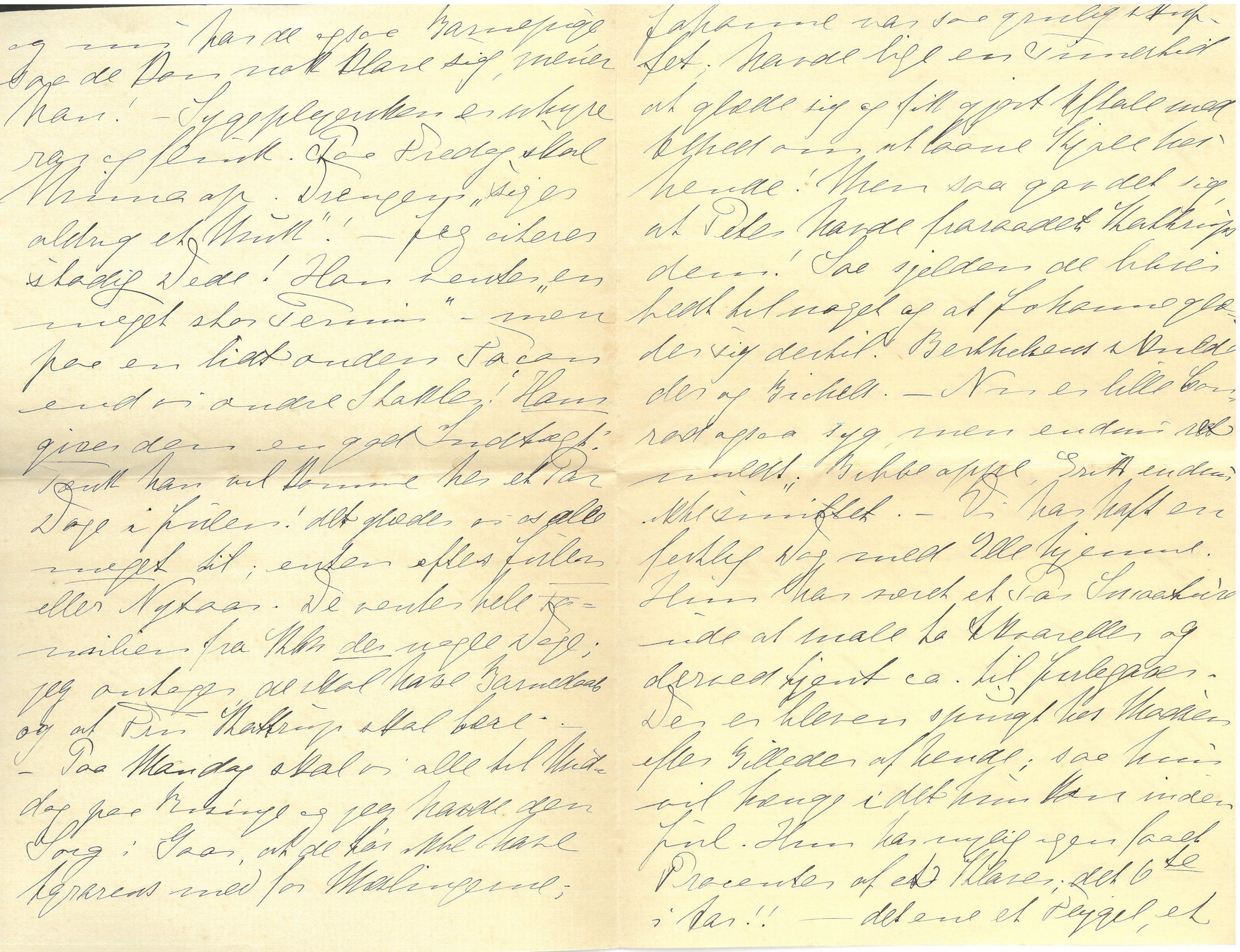 Vi blev meget glade ved Dit sidste Brevkort i Tirsdags; jeg var begyndt at blive en Smule urolig, men saa ringede Alhed og Christine Mandag Aften og fik at vide, det gik godt med Dig. Nu haaber jeg Du faaer denne lille Sending "Bagateller" Søndag Morgen. Vi har som sædvanlig ingen Nyheder at fortælle; det skulde da være, Du endnu ikke har hørt det gode Kup Las har gjort nemlig at Magnussen har købt Malerier for 15000, saa han slipper for at lave Udstillingen, hvad han egentlig nødig vilde saa kort efter den forrige store og efter Kunstforeningens! Og der blev heldigvis en hel Del tilbage, som kan være Grundlag for en Udstilling ad Aare. Af Båxhult Billederne blev de bedste tilbage. Alhed selv solgte for 300. Magnussen var der 4 Dage; det er en elskværdig Mand; de var her med ham til en 5 The, og han saae hele Huset. - I Brædstrup staaer alt saare godt til, veed jeg dels pr. Brev og dels pr. Telefon. Minna nyder i fulde Drag sin Barselseng; bliver overlæsset med Gaver af alle Slags; Ørenringe med Diamanter til 500!! ["til 500!!" indsat over linjen] af sin Broder Frits; en Bankbog med 100 Kr. af Dede samt en magelig Lænestol. De har faaet ny Pige til Nobr; Line sagde op, da det viste sig at der skulde komme en Baby igen!! men den nye er "en Engel", siger Dede, og nu har de ogsaa Barnepige, saa de kan nok klare sig, mener han! - Sygeplejersken er uhyre rar og flink. Paa Fredag skal Minna op. Drengen "siger aldrig et Muk"! - Jeg citerer stadig Dede! Han venter "en meget stor Termin" - men paa en lidt anden Facon end vi andre Stakler! Hans giver dem en god Indtægt? Tænk han vil komme her et Par Dage i Julen! det glæder vi os alle meget til; enten efter Julen eller Nytaar. De venter hele Familien fra Kbh der nogle Dage; jeg antager, de skal have Barnedaab og at Fru Kattrup skal bære. - Paa Mandag skal vi alle til Middag paa Risinge og jeg havde den Sorg i Gaar, at de tør ikke have Agrarens med for Mæslingerne; Johanne var saa grulig skuffet; havde lige en Timestid at glæde sig og fik gjort Aftale med Alhed om at laane Kjole hos hende! Men saa gav det sig, at Peter havde fraraadet Kattrups dem! Saa sjelden de bliver bedt til noget og at Johanne glædede sig dertil. Berthelsens skulde der og Bichels. - Nu er lille Conrad ogsaa syg, men endnu ret mildt; Bibbe oppe, Grethe endnu ikke smittet. - Vi har haft en festlig Dag med Elle hjemme. Hun har været et Par Smaature ude at male to Akvareller og derved tjent ca. til Julegaver. Der er bleven spurgt hos Madsen efter Billeder af hende, saa hun vil hænge i det hun kan inden Jul. Hun har nylig igen faaet Procenter af et Klaver; det 6_te_ i Aar!! - det ene et Flygel, et andet for nylig til 1300 (H. Meier.) Elle og Grethe har siddet derinde og spillet noget fin og kønt firhændigt og da jeg kom ind og skulde høre hvad det var, viste det sig at være Grethes Kompositioner lige ud af Hovedet og Elle ligesaadan Bassen dertil ! Jeg synes det er imponerende og det samme mener Elle og Johanne, som var her til Kaffe og hørte det. Nu er Eller gaaet hen paa Hotellet til Dahlerup, som var her en Visit, mens hun var ude; Grethe i Biografen, her er saa stille og naar dette Brev er færdigt, skal jeg have fat paa mit Maaneds Regnskab. I Morgen skal jeg til Odense, være sammen med Thora, som kommer Kl. 5, og saa til Kirkekoncert med Grethe Kl. 8 og hjem med sidste Tog. Dersom Thora intet veed om at Du er paa Klinik, skal jeg ikke fortælle det; jeg husker nok i Fjor, jeg holdt heller ikke af at faae talt derom. Tante er raskere nu, skrev hun i Gaar; hun har jo længe været snavs. Tonni skal hjem nu; Daisy er kommen fra sin Plads allerede; Tante veed fra Einar C. at de var meget misfornøjede med hende. Vi er stadig uhyre tilfredse med vor Pige i enhver Retning; det er en uhyre Lettelse for mig i Husførelsen. Grethe er saa gode Venner med hende. Jeg veed ogsaa, at hun er glad ved at være her. - Stakkels lille Peter, der endnu ikke er videre! Gid det maa gaae fremad nu uden Tilbagefald. Hvilken Lykke for Eder med den flinke Sygeplejerske! Jeg vil haabe lille Muk at Du nu vil kunne taale Juletravlheden! den nærmer sig jo stærkt. Tænk at der nu er gaaet næsten et Aar, siden I havde mig som halvvejes Patient og allesammen var saa mageløse mod mig! I Vinter er jeg saa rask. - Nu troer jeg ikke Du gider høre mere af denne Smaasnak! Rigtig god Bedring lille Muk! Kærlige Hilsener fra Elle, Grethe og