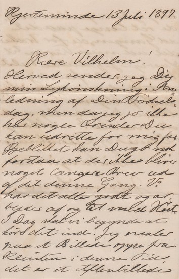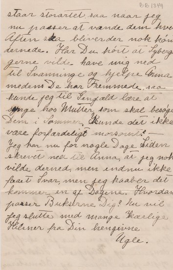 Hjertelig til Lykke paa Fødselsdagen, jeg haaber for Dig at Du nu ser lidt lysere paa Dit Arbejde, saa at Du maa faa en rigtig dejlig Dag i Morgen. – Det er da storartet for Dig at det er rare Mennesker Du er hos. Det er dog en forfærdelig Tørke vi har i denne Tid, vi har plantet nogle Blomster nede i Haven, men jeg maatte først bære en Snes Spande Vand ned paa Bedene for at faa Jorden blødt op saa at Blomsterne kan gro. – Nu til Morgen har jeg skuffet Gangene og klippet Hækken oppe ved Højen og Blomsterne staar storartet, saa naar jeg nu passer at vande dem hver Aften saa bliver der nok kønt dernede. Har Du hørt at Sybergs gerne vilde have mig ned til Svanninge og hjælpe Anna, mens de har Fremmede, saa kunde jeg til Gengæld lære at synge hos Mutter som skal besøge Dem i Sommer. Kunde det ikke være forfærdeligt morsomt? - Jeg har for nogle Dage Siden skrevet ned til Anna, at jeg nok vilde derned, men endnu ikke faaet Svar, men jeg haaber det kommer en af Dagene. Hvordan passer Bukserne Dig? Nu vil jeg slutte med mange kærlige Hilsner fra din hengivne