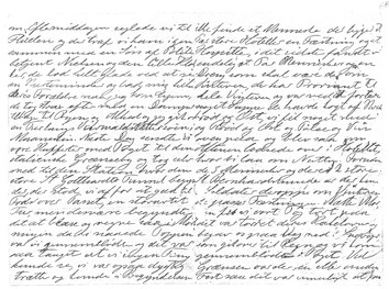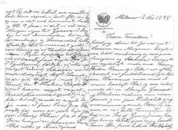 Sidst jeg skrev til Jer var vist i Lusern om Morgenen. Der gik vi saa lidt omkring og saa paa Omegnen og Schweizer Løven, der var nydeligt nede ved Søen og Floden Reuss der løber ned af den, Vandet var fuldstændigt klart som Havvand men med et mere blaat Skær, og saa svømmede der en Mængde Graaænder og Blishøns omkring som man kunde gaa paa Bolværket og nogle morsomme gamle Broer og se paa, de var helt tamme. Der traf vi en Søn af Garver Jensen, han kom hen og hilste paa os, jeg kendte ham ikke, han havde Fuldskæg, om Eftermiddagen sejlede vi til Flüelen og der traf vi ham igen sammen med en Søn af Politimester Nielsen og den lille Klokker, de lod helt glade ved at se en Kerteminder og bad mig hilse deres Forældre naar jeg kom hjem, de tog strax efter med en Damper tilbage til Byen og Alhed og jeg gik en Tur langs Vierwaldsstättersøen i Maaneskin. Næste Dag sendte vi vore Kufferter med Toget til den italienske Grænseby og tog selv med til den Station hvor den store St Gotthardts Tunnel begynder, der stod vi af for at gaa til Fods over Passet, en storartet Tur, men desværre begyndte det at blæse og regne saa i Mørkningen da vi naaede Toppen var vi gennemblødte og det var saa taaget at vi ingen Ting kunde se, vi var ogsaa dygtig trætte og kunde i Begyndelsen ikke finde et Menneske der ligger et Par store Hoteller en Fæstning noget Hospitte, i det sidste fandt vi endelig et Par Mennesker og en Dreng som skal være der om Vinteren, de har Proviant til hele Vinteren og var ved at fortære noget Suppe de havde kogt af Hvedebrød og Ost, vi fik noget med og Brød og Ost og Pølse og Vin ovenpaa og blev saa om Aftenen lodsede over i Hotellet, hvor vi laa om Natten. Foruden de 3 Mennesker og deres 2 store St Bernhardshunde er der kun Soldater deroppe om Vinteren de passer Fæstningen. Næste Morgen fik vi vort Tøj tørt paa det var tørret [ved] deres Kakkelovn og begav os paa Vej ned i Snevejr som gik over til Regn og vi kom Gennemblødte i Toget. Ved Grænsen var der en eller anden Fest saa det var umuligt at faa vort Tøj der var lukket, saa maatte vi lade dem expedere det efter os i Dag og nu er det nok kommet hertil, og Kl 9 faar vi det vi vil nu i Morgen rejse til Genova. I Dag har vi set Domkirken her og Malerisamlingen og Lionardos hellige Nadver. Det er svundet godt i vore Penge og vi tænker at naar vi hen i Ugen kommer til Florents vil vi snart faa nogle fra Jer. I Tyskland brugte vi ikke saa meget men Schweiz var et nederdrægtigt dyrt Land, og der gik 4 Dage i mod 3 i hvert Land, her i Italien lader de til at have noget rimeligere Priser. Nu maa i endelig være klar til at sende os nogle Penge, naar I faar Brev fra Florents, for saa er det lige op over. Mange Hilsner fra os begge Jeres hengivne Johannes Larsen