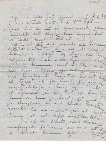 Jeg er spændt på hvad B’s Dreng skal hedde. Hvor kreperligt, at vi ikke kunde faa dem døbt sammen, - Grethe og ham. Min bliver jo så stor, at hun ikke bliver til at slæbe, - for døbes skal hun ikke før vi kommer hjem. – Nej der er kun meget ringe Håb om os i Aar – skønt Harry fabler, om at jeg burde rejse et lille Svip hjem med Frk Th. (Mrs Wards Søster) d. 7de Sept., - men han er jo så sangvinsk. – Hans Samvittighed plager ham meget, fordi vi ikke kom i Foråret. –