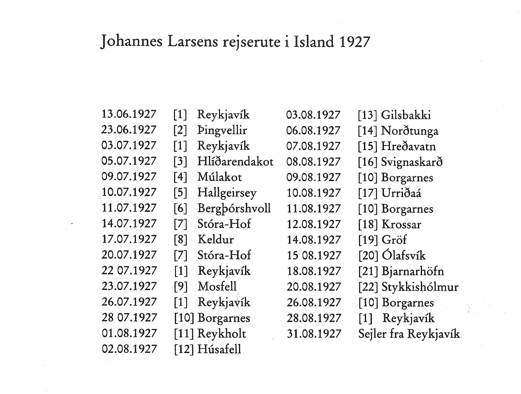 - Góðan dagin Lára mín Eg vakna við það að Larsen kemur inn til mín kl er 7 mig var að dreima Svönu í alla nótt heldur hefði ég nu viljað að mig hefði dreimt heim jæja vina mín ég dríf mig í fötin og drekk svo kaffi og fer syðan út að mala eg kem heim kl 1 en fer strags aftur veðrið er indælt og um að gera að nota það kl 5 kem ég aftur þá er Larsen að koma til að borða hefur verið að teikna syðan kl 10 í morgun. nú ætlum við að halda á stað hjeðann og í Stikkishólm við fáum bóndan til að flytja okkur á 5 hestum við förum yfir Beserkjahraun á fljugandi ferð við höfum ágæta hesta ég hefi gráan hest sem er einhver besti hestur sem ég hefi komið á bak við komum kl 9 í Stikkishólm og höldum til á hótelinu þar hitti ég gamla kunningja frá því ég var hjer síðast við drekkum kaffi og förum svo að sofa Góða nótt elsku vinir.