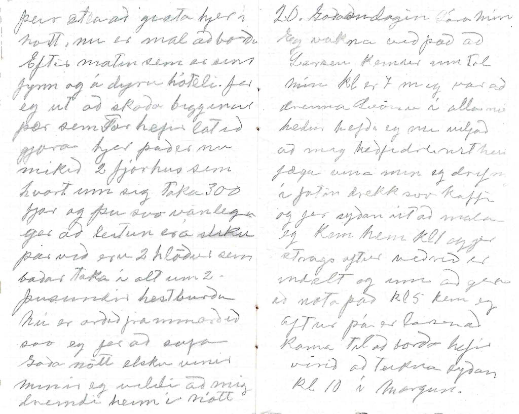 - Godmorgen, min kære. Jeg vågner ved, at Larsen kommer ind på mit værelse klokken 7. Jeg drømte om Svönu hele natten. Men nu ville jeg ønske, jeg var fløjet hjem. Nå, min ven. Jeg skynder mig at klæde mig på, drikke kaffe og går ud for at male. Jeg kommer hjem kl 1, men går straks ud igen. Vejret er skønt, og jeg vil benytte mig af det. Jeg kommer tilbage kl 5 så kommer Larsen for at spise han har tegnet siden kl 10 i morges. Nu skal vi til Stikkishólmur. Vi får bonden til at transportere os med 5 heste. Vi krydser Beserkjahraun i flyvende fart. Vi har fremragende heste jeg har en er grå hest, der er en af de bedste heste, jeg nogensinde har redet. Vi ankommer til Stikkishólm kl 9 og tager til hotellet hvor jeg skal møde en gammel bekendt fra sidste gang, jeg var her. Vi drikker kaffe og går derefter i seng. Godnat, kære venner.