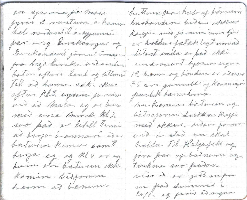 - Góðan dagin vinir mínir í dag ætlum við á Breiðafjarðareyjar eg fer út strags kl 8 til að útvega bát við faum agætan mótorbat huggulegan og ganggóðann við förum um borð vertinn filgir okkur niður á briggju og nú af stað sjóferðin geingur vel við forum framhjá mörgum eyjum þar er fólk í óðaönn að heyja það er ágætt veður í dag bjart og heiðskírt en kalt. Við erum tæpan klukkutima á ferð þar til við komum að Öxney þar sem Eiríkur Rauði bjó áður hann fór til Grænlands hjer förum við í land og fáum dreing hjer á bænum til að vísa oss leið að rústum Eiríksbæjar þær eru nú varla leingur greinilegar en sjá má þó mota fyrir 8 rustum á haum hol norðantil á eyjunni þar er og Eiríksvogur og Eiríksnaust gömul örnefni frá bigð Eiríks. við sendum bátin aftur í land og ætlumst til að hann sæki okkur aftur kl 3 syðan förum við að mála. eg er búin með eina mind kl 2 svo það er lítill tími að birja á annari áður baturinn kemur samt birja eg og kl 4 er ég búin og en báturinn ekki komin. Við förum heim að bænum hittum þar hop af börnum husbondin biður okkur kaffi við förum inn hjer er heldur fátæklegt um að litast enda er það ekki undravert hjónin eiga 12 born og bóndin er aðeins 36 ára gamall og konan ingri þvílík barnahrúga. nú kemur báturin og bátsstjórin drekkur kaffi með okkur. síðan förum við á stað nú skal halda til Helgafels og fara þar af bátnum og teikna svo þaðan veðrið er gott enþá en það dimmir þar í lofti og fer að rigna til fjalla þegar við erum komnir hálfa leið þá bretum við á ætlun og förum beint til St.hólms en það stendur heima þegar við erum nýkomnir hjer inn þá birjar að rigna. hjer er ágætt að vera eitt með bestu hótelum sem við höfum haft og sama seigir Larsen hann seigir það besta hótel á Íslandi við faum agætan mat og erum líka ornir matlistugir því við höfum ekki borðað síðan kl 10 í morgun. Eftir matin förum við út til að hitta danska menn sem hjer eru og Larsen þekkir við erum stutt hjá þeim en förum heim og Larsen fer að hátta en þegar hann er nýháttaður kemur Ágúst Þórarinsson að sækja okkur en Larsen nennir ekki að fara á fætur svo ég fer einn eg er þar til kl 12 og skemti mjer vel þá fer ég heim að hátta og sofa. Góða nótt elskan mín.