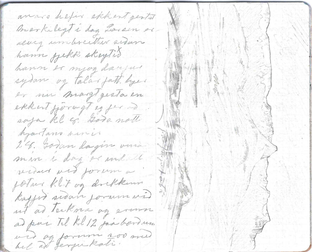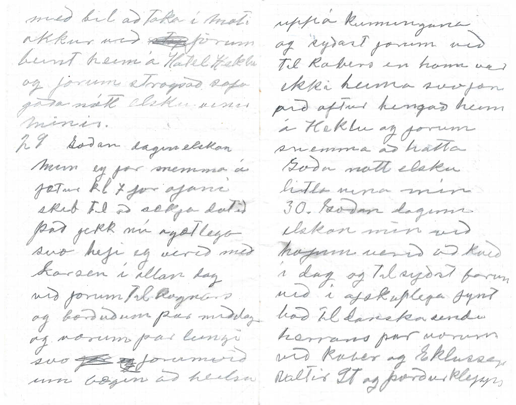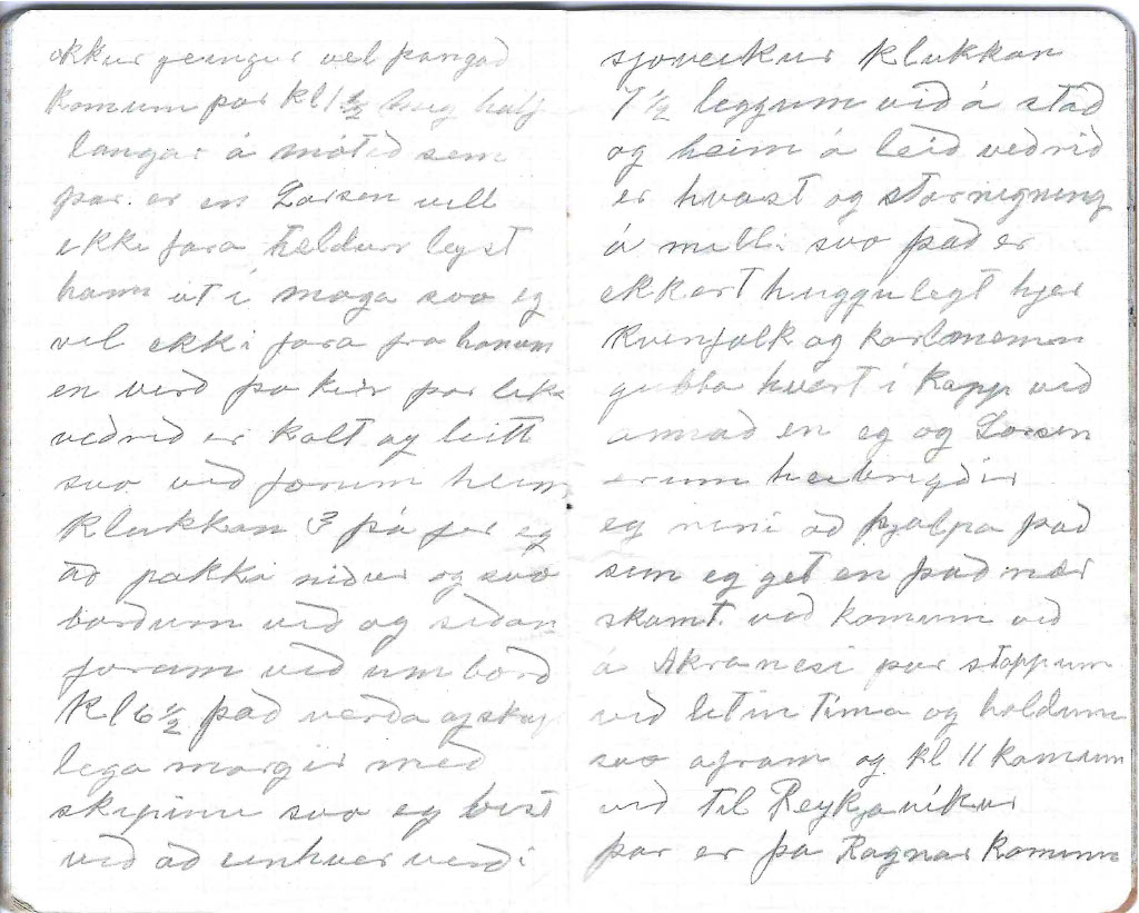 1. Godmorgen mine venner, i dag er vejret dejligt, og vi står op klokken 7 og drikker kaffe, så går vi ud for at tegne, og vi ved bliver til klokken 12, så spiser vi, og så tager vi en bil til færgen.Turen går godt og vi kommer derhen kl 1½. Jeg ville gerne være med til sammenkomsten der er der, men Larsen vil ikke med, og han ligger sig i græsset, jeg vil ikke efterlade ham, og så er jeg bliver der også. Vejret er koldt og elendigt, så vi tager hjem klokken 3. Jeg begynder at pakke, og så spiser vi, og går om bord kl 6½. Der kommer en frygtelig masse mennesker med på skibet, så jeg forventer, at nogen bliver søsyge. Kl 7½ lægger vi fra land og sejler hjemad. Vejret er blæsende og med kraftig regn ind imellem, så det er ikke behageligt her, kvinder og mænd kaster op om kap, men Larsen og jeg er ikke søsyge. Jeg prøver at hjælpe, så godt jeg kan, men det når ikke langt. Vi ankom til Akranesi, stoppede der et kort øjeblik og sejlede derefter videre, kl 11 ankom vi til Reykjavík, hvor Ragnar var ankommet med en bil for at møde os. Vi tog direkte til Hotel Hekla og gik straks i seng. Godnat, mine elskede venner.