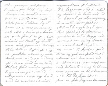 1. Góðan dagin vina mín í dag er indælt veður og við förum á fætur kl 7 og drekkum kaffið síðan förum við út að teikna og erum að því til kl 12 þá borðum við og förum svo með bíl að ferjukoti. Okkur geingur vel þangað komum þar kl 1½ mig hálflangar á mót sem þar er en Larsen vill ekki fara heldur legst hann út í móga svo ég vil ekki fara frá honum og verð því kir þar lika veðrið er kalt og leitt svo við förum heim kl 3 fer ég að pakka niður og svo borðum við og síðan förum við um borð kl 6 ½. Það verða afskaplega margir með skipinu svo ég bíst við að einhver verði sjóveikur. Kl 7 ½ leggjum við á stað og heim á leið veðrið er hvasst og stórrigning á milli svo það er ekkert huggulegt hjer kvenfólk og karlmenn gubba hvert í kapp við annað en ég og Larsen eru heilbrigðir eg reini að hjálpa það sem ég get en það nær skamt. við komum við á Akranesi þar stoppum við lítin tíma og höldum svo áfram og kl 11 komum við til Reykjavíkur þar er þá Ragnar kominn með bil að taka á móti okkur við förum beint heim á Hotel Heklu og fórum stragsað sofa góða nótt elsku vinir mínir.