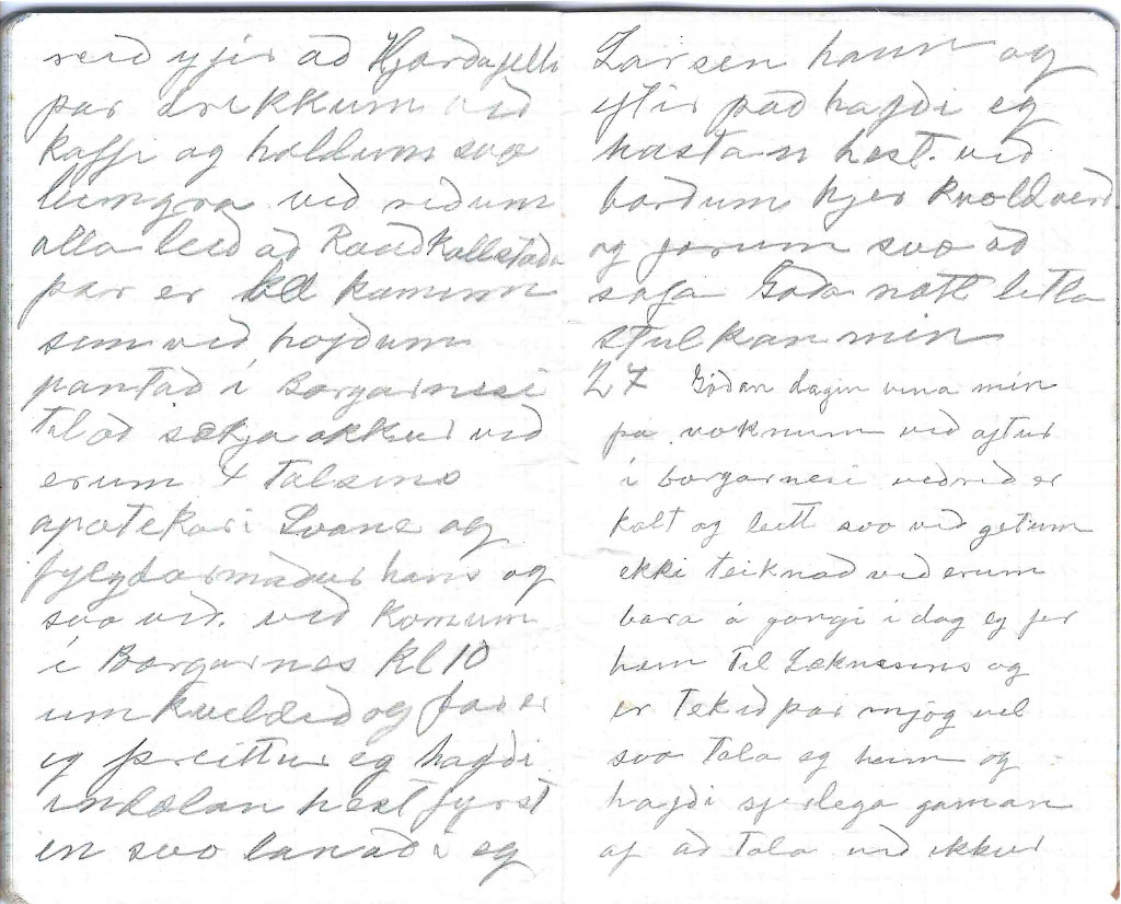 - Góðan dagin vina mín. þá vöknum við aftur í borgarnesi. Veðrið er kalt og leitt svo við getum ekki teiknað við erum bara á gangi í dag eg fer heim til læknisins og er tekið þar mjög vel svo tala ég heim og hafði sjerlega gaman af að tala við ikkur annars hefur ekkert gerst merkilegt í dag er Larsen alveg umbreittur síðan hann fjékk skeytið hann er mjög dapur syðan og talar fátt hjer er nú margt gesta en ekkert fjörugt eg fer að sofa kl 8. Góða nótt hjartans vinir.
