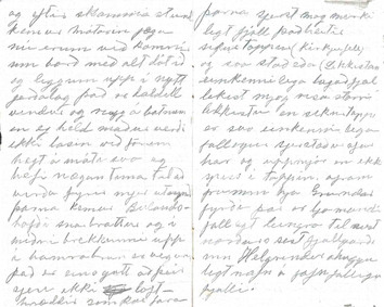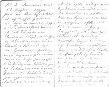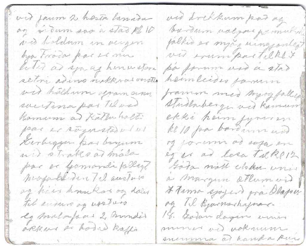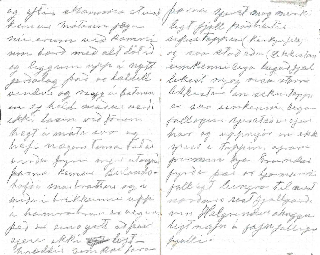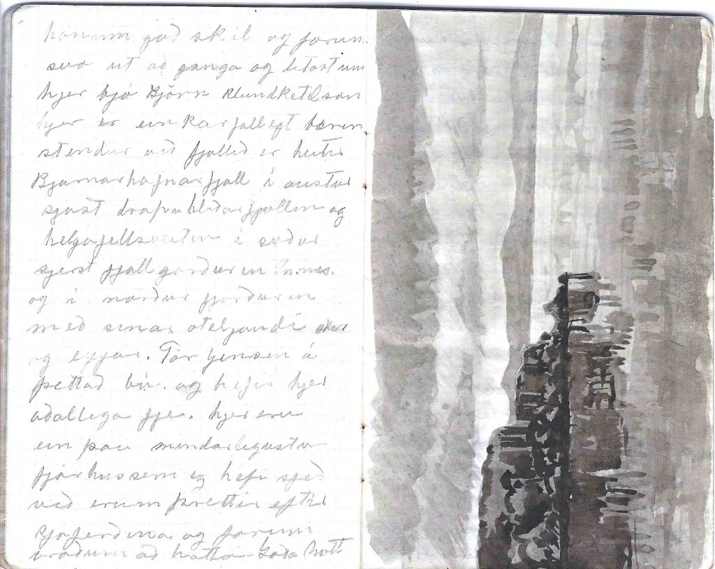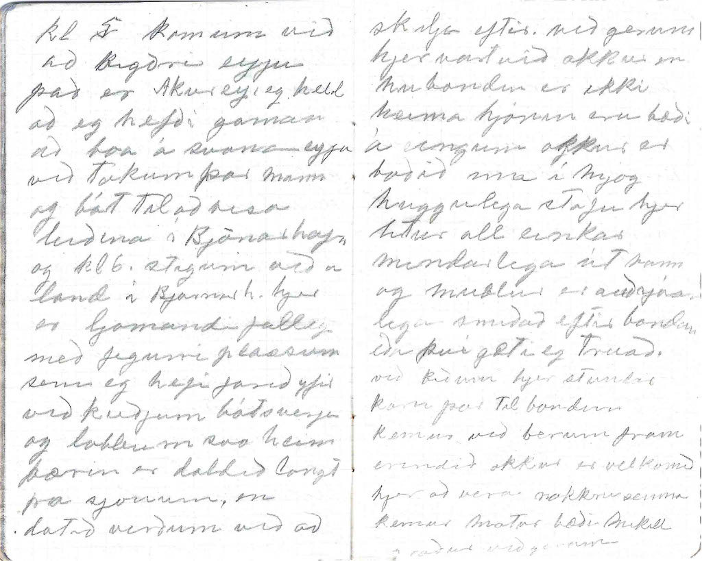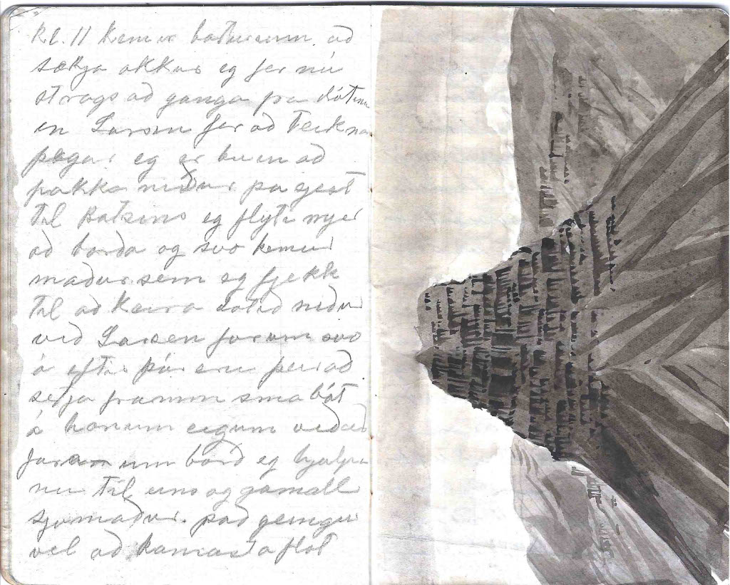 - Góðan dagin vinir mínir við voknum snemma að vanda því kl 11 kemur báturinn að sækja okkur eg fer nú strags að ganga frá dótinu en Larsen fer að teikna. þegar ég er búin að pakka niður þa sjest til bátsins eg flyti mjer að borða og svo kemur maður sem ég fjekk til að keira dotið niður við Larsen fórum svo á eftir þá eru þeir að setja fram smabát á honum eigum við að fara um borð eg hjálpa nu til eins og gamall sjómaður. það gengur vel að komast á flot og eftir skamma stund kemur mótorin jæja nú erum við komnir um borð með alt dótið og leggjum upp í nýtt ferðalag það er daldill vindur og rugg á bátnum en ég held maður verði ekki lasin við förum hægt á móti svo ég hefi nægan tíma til að virða fyrir mjer utsynið þarna kemur Búlandshöfði snarbrattur og á miðri brekkunni upp á hamrabrún er vegurinn það er eins gott að þeir sjeu ekki lofthræddir sem þar fara þarna sjest mjög merkilegt fjall það heitir Sikurtoppur (Kirkjufell) og svo Stoð eða (Líkkistan) einkennilega lagað fjal líkist mjög risa stórri líkkistu en sikurtoppurinn er svo einkennilega fallegur sjerstæður afar hár og uppmjór en ekki sjest í toppin. afram fram hjá Grundarfyrði þar er ljómandi fallegt leingra til aust-norðurs sést í fjallgarðinn Helgrindur óhuggulegt nafn á jafn fallegu fjalli. kl 5 komum við að bigðri eyju það er Akurey. eg held að ég hefði gaman af að búa á svona eyju við tokum þar mann og bát til að vísa leiðina í Bjarnarhöfn og kl 6 stígum við á land í Bjarnarh. hjer er ljómandi fallegt með fegurri plássum sem hefi farið yfir við kveðjum bátsverja og löbbum svo heim bærinn er dáldið langt fra sjónum, en dótið verðum við að skilja eftir. við gerum hjer vart við okkur en husbóndin er ekki heima hjónin eru bæði á engjum okkur er boðið inn í mjög huggulega stofu hjer lítur alt einkar mindarlega út ramar og mublur er auðsjáanlega smíðað eftir bondan eða því gæti ég trúað. við bíðum hjer stundarkorn þar til bondinn kemur við berum fram erindið okkur er velkomið hjer að vera nokkru seinna kemur matur bæði mikill og góður við gerum honum góð skil og förum svo út að ganga og litast um hjer bjó Björn Blundketilsson hjer er einkar fallegt bæjarstæði við fjallið sem heitir Bjarnarhafnarfjall i austur sjást drápuhlíðarfjöllin og helgafellssveitin í suður sjest fjallgarðurin og í norður fjörðurinn með sín óteljandi sker og eyjar. Tor Jensen á þetta bú og hefur hjer aðallega fje. hjer eru ein þau mindarlegustu fjárhús sem ég hefi sjeð við erum þreittir eftir sjóferðina og förum bráðum að hatta Góða nótt