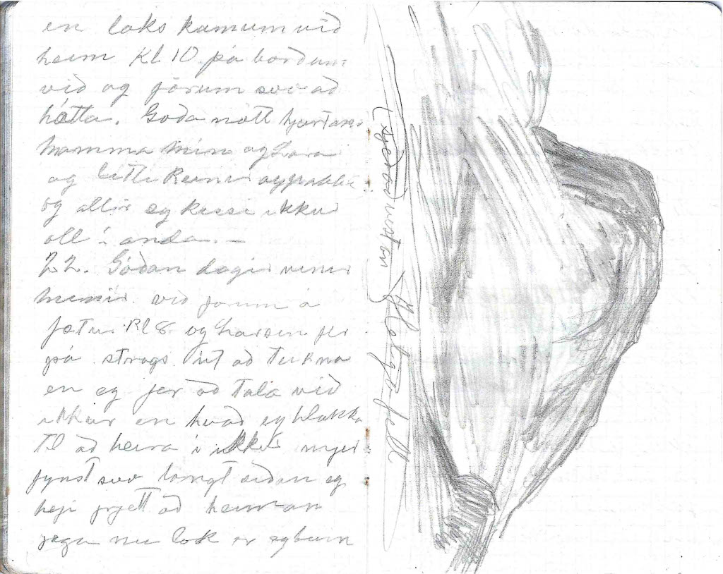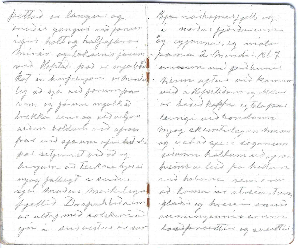 - Godmorgen, små venner, vi står tidligt op, for nu skal vi på en lang gåtur. Vi skal til landets ældste parlamentsbygning, nemlig Hofstaðir i Þorsnes, det er en 2 timers gåtur hver vej. Jeg begynder dagen med at forsøge at ringe hjem. Jeg venter ved telefonen i 2 timer, og intet virker, så jeg er nødt til at gå, men i morgen prøver jeg igen. Nå, nu skal vi et sted hen. Alle her skal på ridetur. Det er søndag mine kære venner det ville være dejligt, hvis I var her. Det er en lang og vanskelig gåtur. Vi krydser en skov og halvt ufremkommelige moser. Endelig ser vi Hofstaðir. Det er en meget lille hytte, men husholdersken ser hyggelig ud. Vi går derind og får mælk at drikke, så meget vi vil. Så fortsætter vi, indtil vi ser Dritsker hvor vi sætter os og begynder at tegne. Det er meget smukt her. Mod syd kan man se det mærkelige bjerg Drapuhlíð, som altid er solrigt. Mod sydvest er der Bjarnarhafnarfjall mod nord er der fjorden og øerne. Jeg maler 2 billeder der. Kl 7 er vi klar til at tage hjem. Vi ankommer til Hofstaðir, hvor vi bliver budt på kaffe, og jeg taler længe med bonden en meget behagelig mand og god til at fortælle historier, så fortsætter vi vores vej hjem, vi møder drengene, der kommer tilbage fra rideturen, glade og muntre, men vi stakkels mennesker er dødtrætte og svedige, men endelig kommer vi hjem kl 10 vi spiser og går i seng. Godnat, min hjertes mor og Lára og lille Reinir og far og alle sammen, jeg kysser jer alle i ånden.