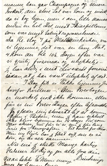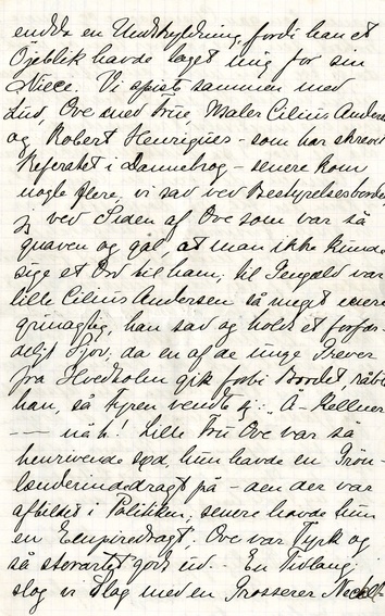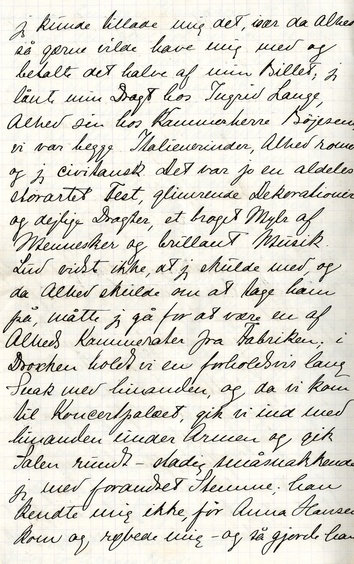 I Morgen er det jo så din Fødselsdag, og vi skal i den Anledning se at få forfattet nogle Epistler; først vil jeg gratulere dig mange mange Gange; vi vil fejre Dagen ved at drikke Chokolade i Morgen Aften – vist nok sammen med Lud, hvis vi kan få fat på ham Han har for Resten nylig været her, Han kom Aftnen efter Karnevalet for at snakke om dette. I har jo hørt, at jeg kom med, jeg har nu fået min omtalte Elev, så mente jeg nok, jeg kunde tillade mig det, især da Alhed så gærne vilde have mig med og betalte det halve af min Billet; jeg lånte min Dragt hos Ingrid Lange, Alhed sin hos Kammerherre Bøjesen vi var begge Italienerinder, Alhed romer og jeg civitansk. Det var jo en aldeles storartet Fest, glimrende Dekorationer og dejlige Dragter, et broget Mylr af Mennesker og brillant Musik. Lud vidste ikke, at jeg skulde med, og da Alhed skulde om at tage ham på, måtte jeg gå for at være en af Alheds Kammerater fra Fabriken, i Droschen holdt vi en forholdsvis lang Snak med hinanden, og da vi kom til Koncertpalæet, gik vi ind med hinanden under Armen og gik Salen rundt – stadig småsnakkende jeg med forandret Stemme; han kendte mig ikke, før Anna Hansen kom og røbede mig – og så gjorde han endda en Undskyldning, fordi han et Øjeblik havde taget mig for sin Niece. Vi spiste sammen med Lud, Ove med Frue, Maler Cilius Andersen og Robert Henriques – som har skrevet Referatet i Dannebrog – senere kom nogle flere, vi sad ved Bestyrelsesbordet, jeg ved Siden af Ove som var så gnaven og gal, at man ikke kunde sige et Ord til ham; til Gengæld var lille Cilius Andersen så meget mere grinagtig, han sad og holdt et forfærdeligt Sjov; da en af de unge Grever fra Hvedholm gik forbi Bordret, råbte han, så Fyren vendte sig: ”Å – Kellner --- nåh!["] Lille Fru Ove var så henrivende sød, hun havde en Grønlænderindedragt på – den der var afbildet i Politiken; senere havde hun en Empiredragt; Ove var Tyrk og så storartet godt ud. – En Tidlang slog vi Slag med en Grosserer Neckelmanns, han gav Champagne og senere Frokost; den store Sal var tom og mørk da vi tog hjem, men i den lille dansede endnu en hel Del, mest Skuespillerne, som var meget talrigt repræsenterede. Da Kl. slog 7 på Mathæuskirken, var vi hjemme, det var en lang Nat, vi kom der Kl. 10½. Dagen efter var vi gruelig forsvirede og ulykkelige – jeg har aldrig i mit Liv forsviret sådan, at jeg har været ulykkelig af det. - - - I Dag fik vi Pakke hjemmefra hvorfor kvitteres - ! Men Brevbogen er mærkelig nok ikke kommen, ellers får vi nu Breve Dagen efter Afsendelsen. Jeg glæder mig storartet til at komme hjem i Påsken, men jeg kan sikkert ikke blive hjemme en 14 Dages Tid, som Mor skrev, nu får vi se, om jeg får lang Ferie fra Stenografien. Til Fordel for Mor: Min ny Kjole har jeg fået syt, den er så køn, sige de alle sammen.