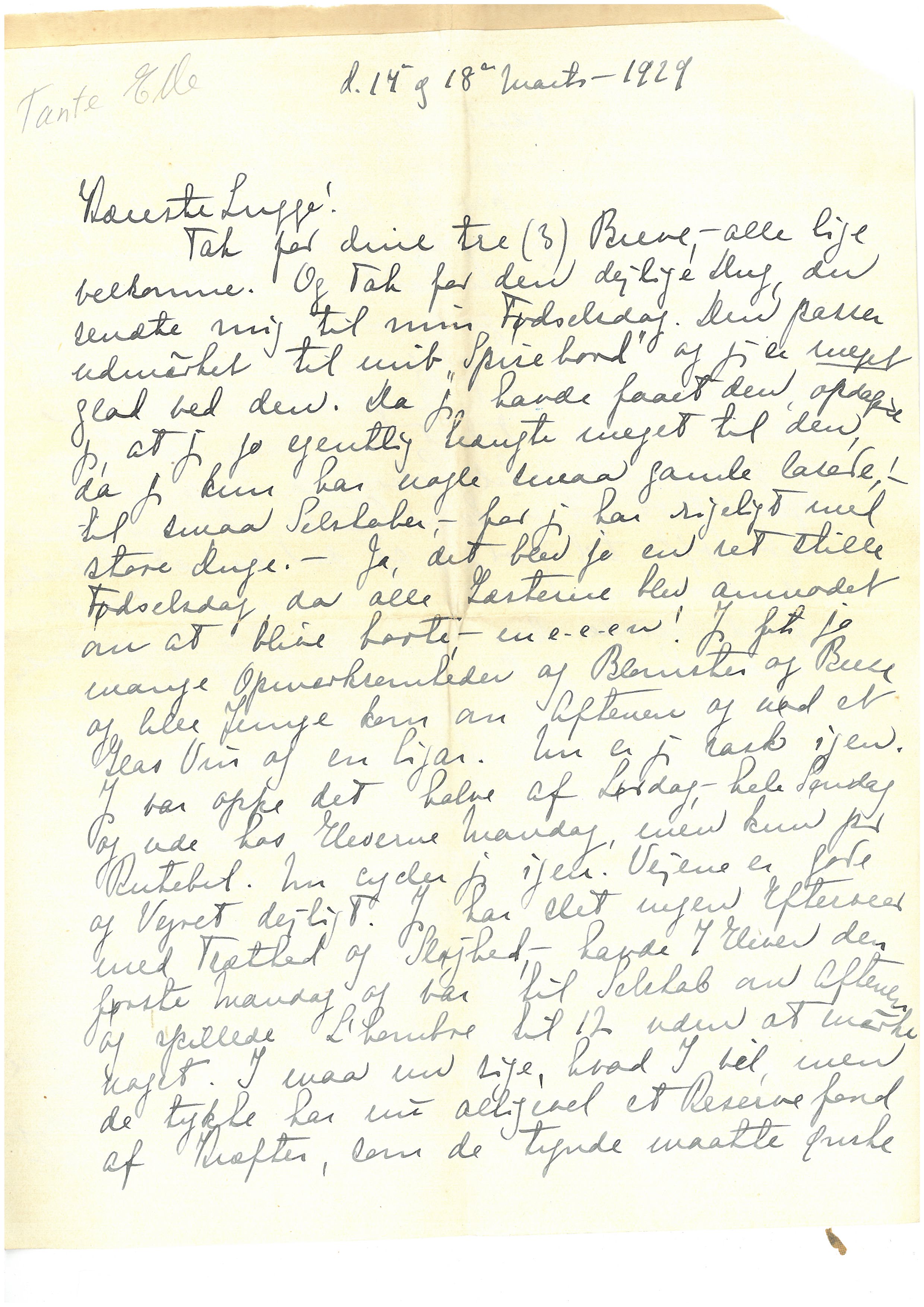 Tak for dine tre (3) Breve, - alle lige velkomne. Og Tak for den dejlige Dug, du sendte mig til min Fødselsdag. Den passer udmærket til mit "Spisebord" og jeg er meget glad ved den. Da jeg havde faaet den, opdagede jeg, at jeg jo egentlig trængte meget til den, da jeg kun har nogle smaa gamle Laser, - til smaa Selskaber, for jeg har rigeligt med store Duge. - Ja, det blev jo en ret stille Fødselsdag, da alle Gæsterne blev anmodet om at blive borte, - me-e-en! Jeg fik jo mange Opmærksomheder af Blomster og Breve og lille Junge kom om Aftenen og nød et Glas Vin og en Cigar. Hun er jo rask igen. Jeg var oppe det halve af Lørdag, - hele Søndag og ude hos Eleverne Mandag, men kun pr Rutebil. Nu cycler jeg igen. Vejene er fine og Vejret dejligt. Jeg har slet ingen Efterveer med Træthed og Sløjhed, - havde 7 Elever den første Mandag og var til Selskab om Aftenen og spillede L'hombre til 12 uden at mærke noget. I maa nu sige, hvad I vil, men de tykke har nu alligevel et Reservefond af Kræfter, som de tynde maatte ønske sig. Det har været en mager Vinter, hvad Indkomster angaar, - 3 Uger syg og en Del Forsømmels paa Gr. af Vejret. Heldigvis faldt en Del af Vejret og Sygdommen sammen - (nu vrimler Gækker og Krokus op i Haven, - skønt der endnu ligger en Meters Sne i Ribsbuskene). Naa men det gør jo heller ikke noget med det Pengetab nu, da vi jo vælter i Penge, - takket være vores kære Pallam og gode gamle Onkel Syberg. Ja, Lugge, det er ogsaa rart at vi kan tænke, at han holdt sit Løfte til Mor, og at du vandt Chokoladen. Ja, hvor man under Mornine en lille glansfuld Periode. Den bliver vel ikke lang, - kender man hende ret. Men tænk, at komme ud af sin Gæld, - det maa da være herligt. Nej, Lugge, jeg vil ikke købe Livrente, ikke foreløbig da. Jeg vil eje 10,000 først. Dem skal jeg nok faa, naar jeg bare maa beholde Helsen en halv Snes Aar. Jeg har 6000 nu. De giver mig 270 om Aaret. 154 har jeg i Legater, det er 424. For dem kan jeg købe 500 Kr. Obligationer omAaret. Saa kan du selv regne ud. - Man kan aldrig vide, hvordan det kan gaa. Jeg kunde jo faa Lyst til at købe mig en Forretning af en Slags, - det er i al Fald mere morsomt at have Pengene at manøvrere med, end at