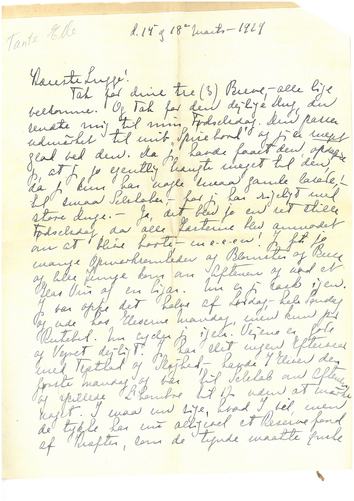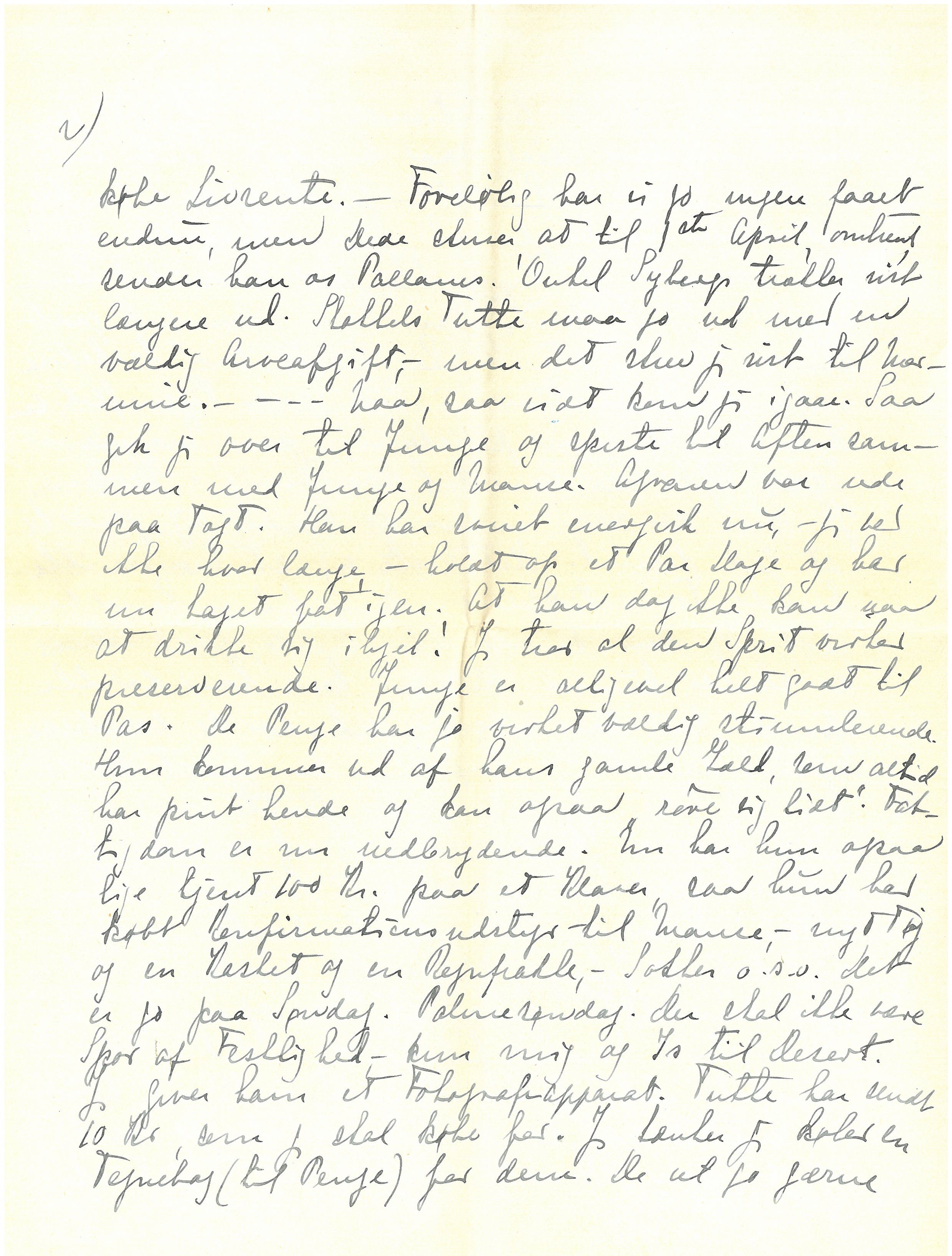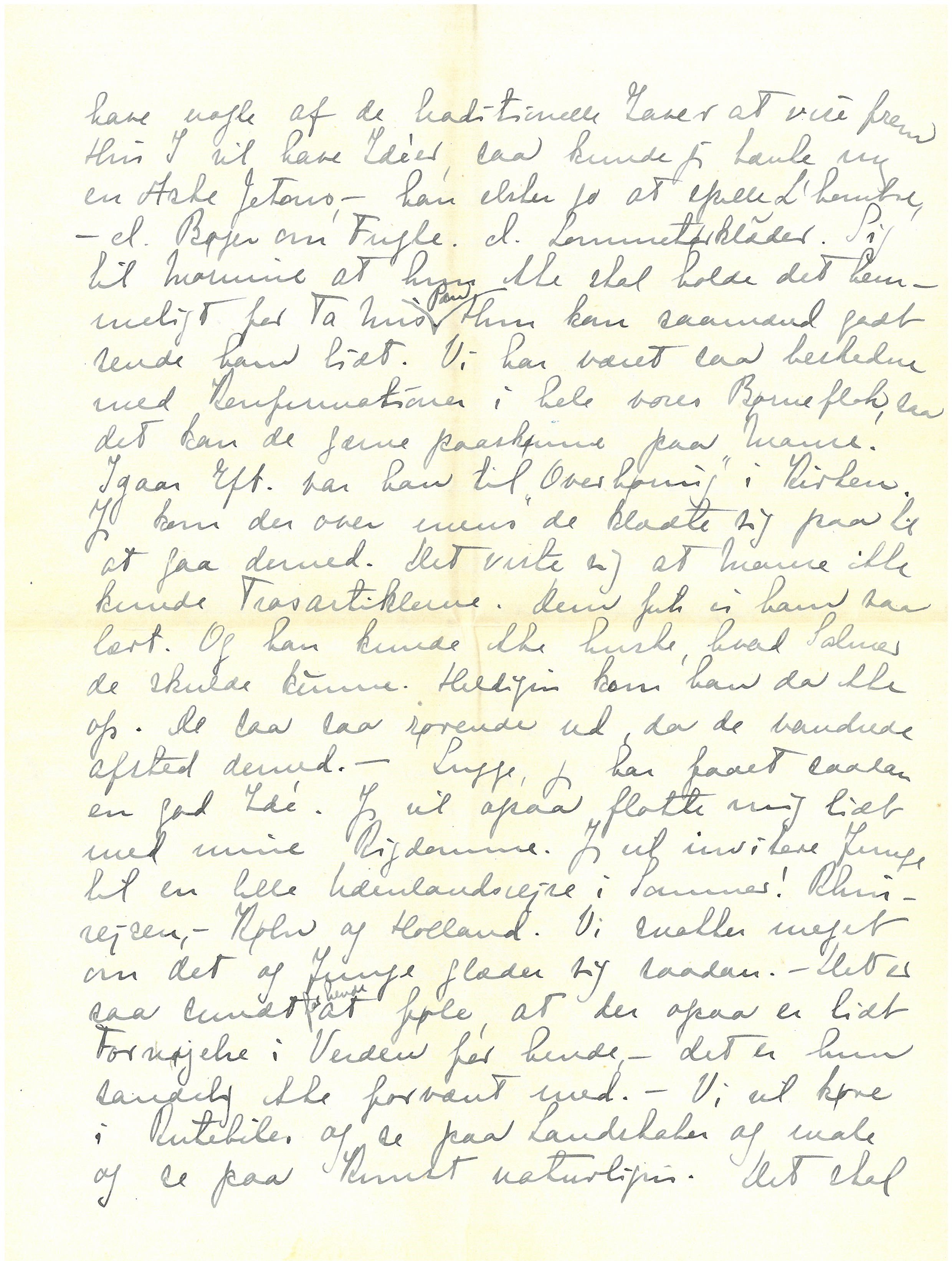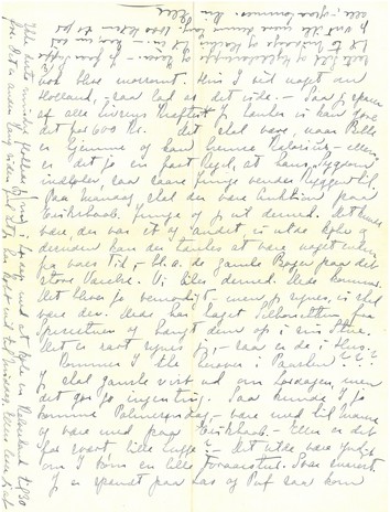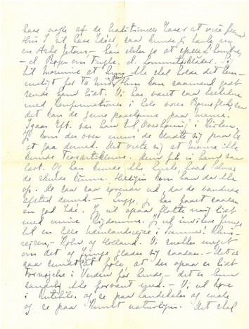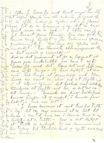 Kommer I ikke herover i Paasken??? Jeg skal ganske vist ud om Lørdagen, men det gør jo ingenting. Saa kunde I jo komme Palmesøndag, - være med til Manse og være med paa Erikshaab. - Eller er det for svært, lille Lugge? - Det vilde være yndigt om I kom en lille Foraarstur. Svar snarest. Jeg er spændt paa Las og Puf saa kom i Aftes. Jeg holder Øje med Huset, men [et ulæseligt ord indsat over linjen] har ikke set nogen spanke om dér endnu. Jeg maa op og se efter inden jeg cycler ud. - Jeg glæder mig til de er hjemme igen. Det er saa tomt naar de er væk. - I Aftes var jeg til Koncert paa Thornøe. Den var god. Fru Berner sang herligt og Chr. Erbennen spillede guddommeligt. Hvor han dog spiller vidunderligt. Fru Chenowitz akkompagnerede. Hun er lidt massiv og enevældig. -