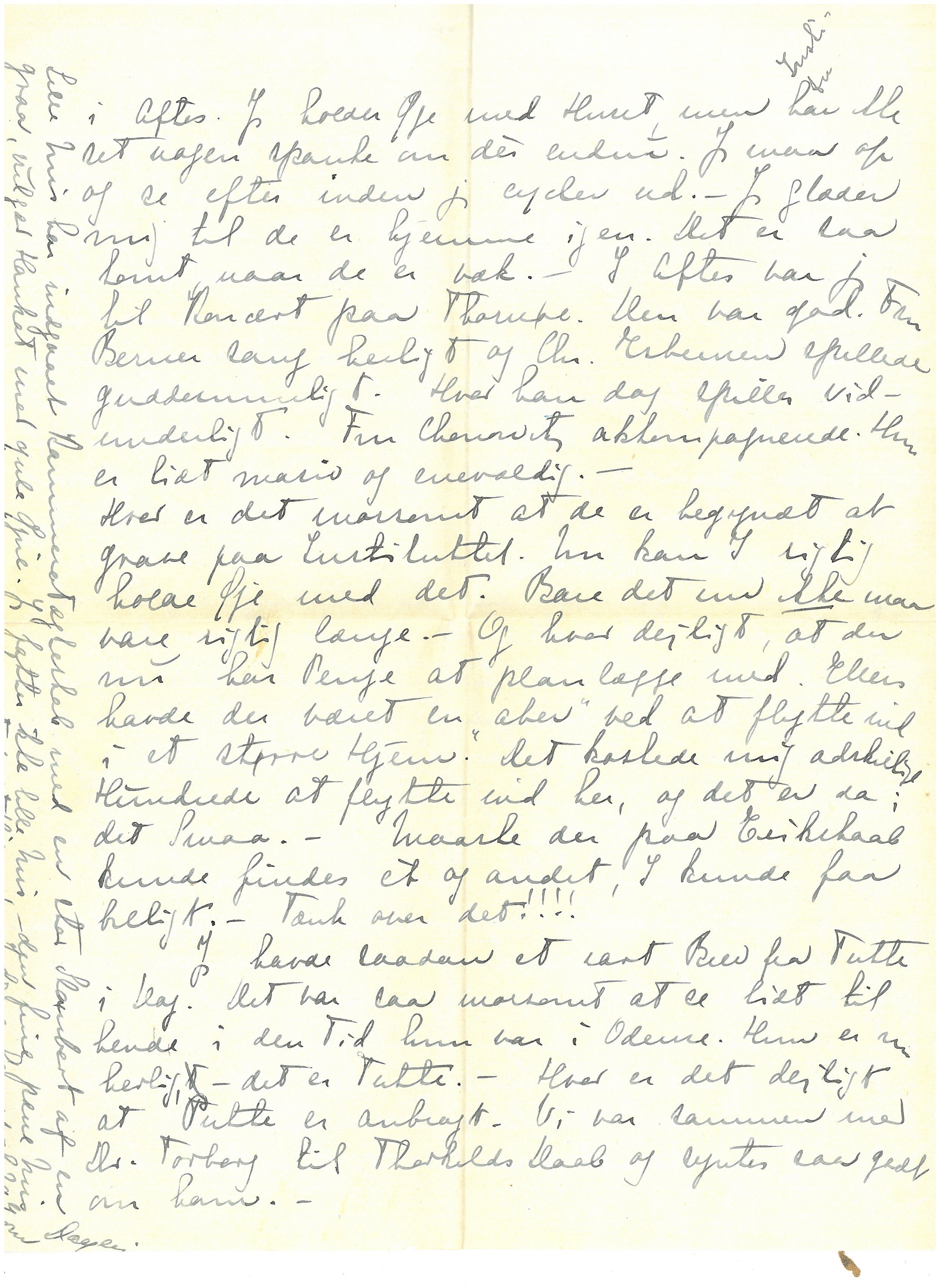 Jeg havde saadan et rart Brev fra Tutte i Dag. Det var saa morsomt at se lidt til hende i den Tid hun var i Odense. Hun er nu herligt, ["t" sidst i ordet overstreget] - det er Tutte. - Hvor er det dejligt at Putte er anbragt. Vi var sammen med Dr. Torborg til Thorkilds Daab og syntes saa godt om ham. -