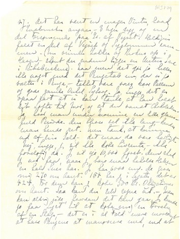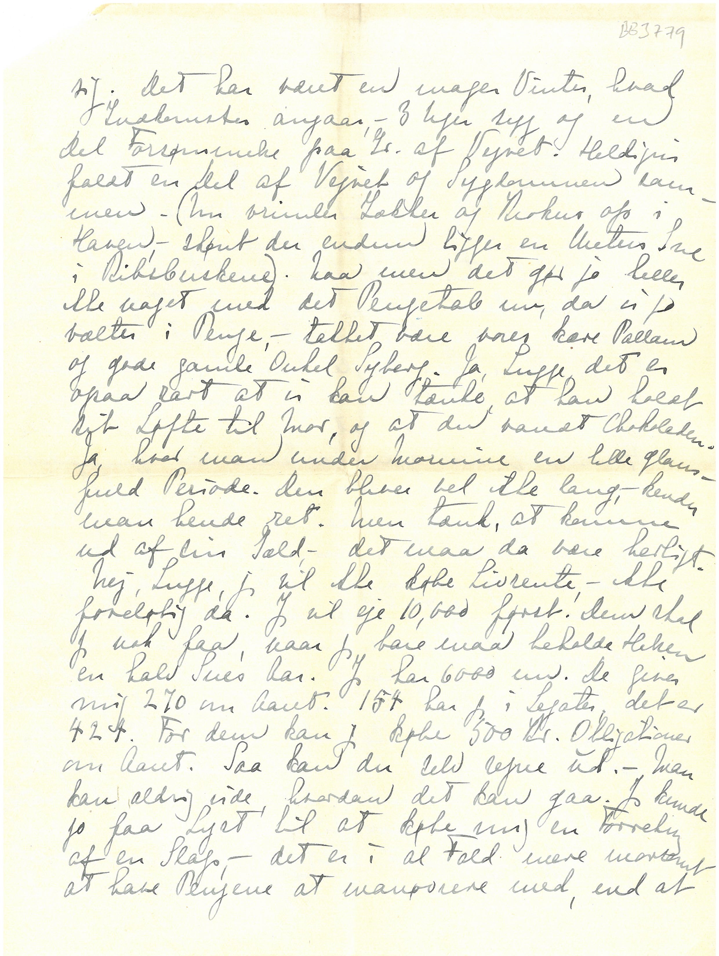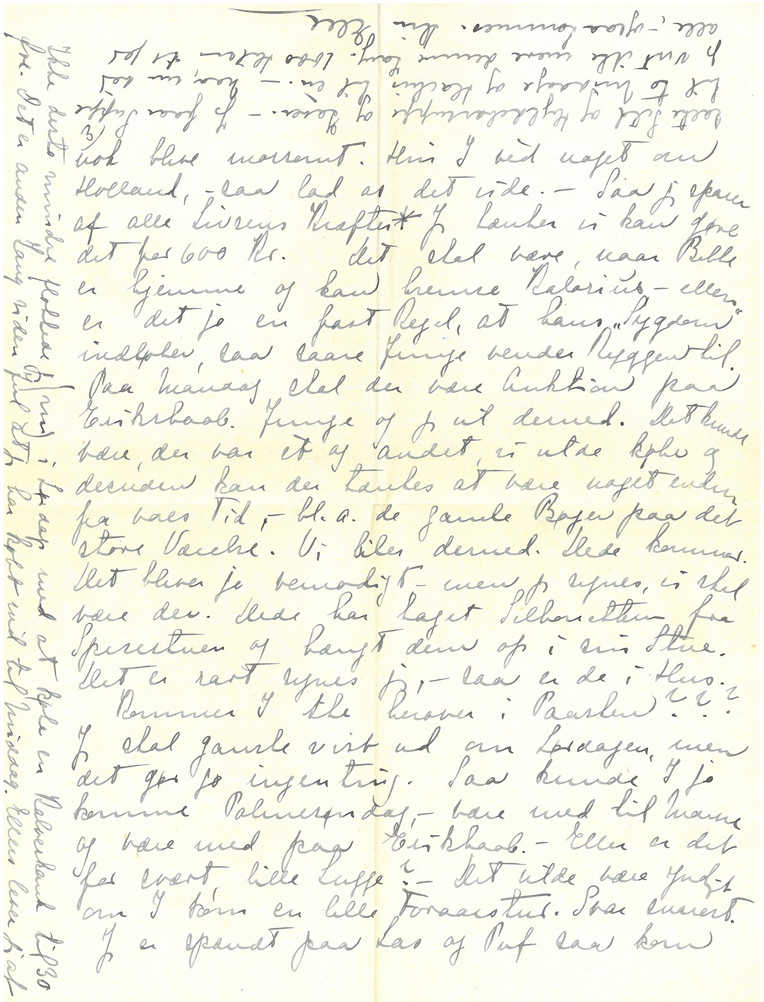 Ikke desto mindre flottede jeg mig i Lørdags med at købe en Kalveskank til 30 Øre. Det er anden Gang siden Jul at jeg har købt ind til Middag. Ellers lever jeg af [teksten fortsætter øverst s. 3; på hovedet] salte Sild og Hyldebærsuppe og Gaver. - Jeg faar Suppe til to Middage og Hachis til èn. - Naa, nu vèd jeg vist ikke mere denne Gang. 1000 Hilsner til jer alle, - ogsaa Lommes. Din Elle
