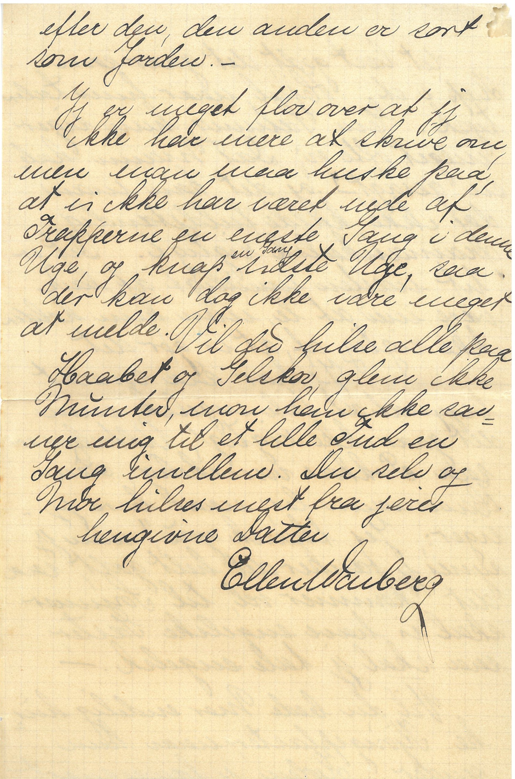 Den første del af brevet mangler, og der ses ingen datering. Ellen Warberg, g. Sawer, var i huset hos Havemann-familien i Hamburg januar til maj 1892.