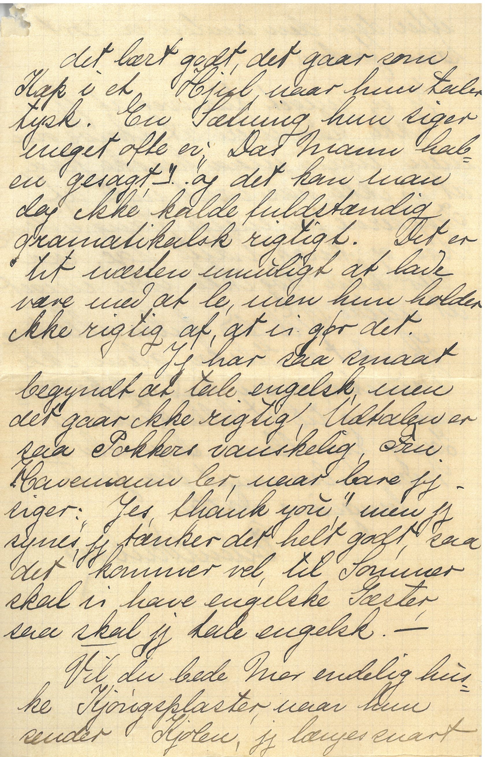 Jeg har saa smaat begyndt at tale engelsk, men det gaar ikke rigtig, Udtalen er saa Pokkers vanskelig, Fru Havemann ler, naar bare jeg siger: ”Yes, thank you”, men jeg synes, jeg tænker det helt godt, saa det kommer vel, til Sommer skal vi have engelske Gæster, saa skal jeg tale engelsk. – Vil du bede Mor endelig huske Kjøngsplaster, naar hun sender Kjolen, jeg længes snart efter den, den anden er sort som Jorden. –