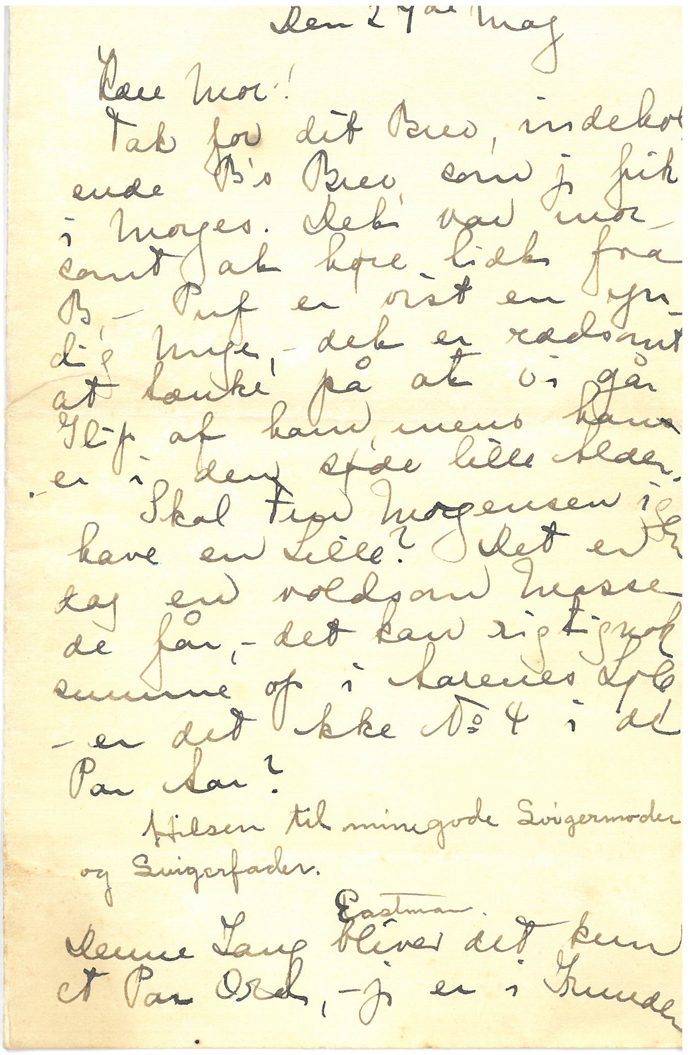 [Med Harris Eastmans skrift:] Hilsen til min gode Svigermoder og Svigerfader.
