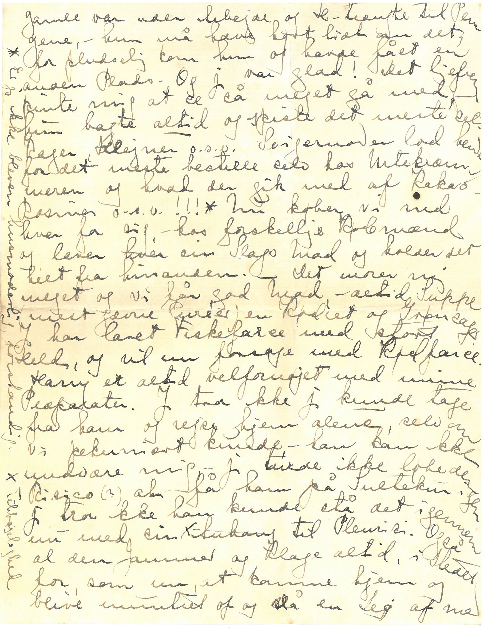 Vi har mistet Mimmi - Perlen, - men ere i Grunden vel tilfredse dermed (- jeg er da). Jeg holdt på, at det var dumt at holde så kostbar Hjælp 4 Dol-ugentlig, - når den gamle var uden Arbejde og H. trængte til Pengene, - hun må have hørt lidt om det, for pludselig kom hun og havde fået en anden Plads. Og jeg var glad! Det ligefrem pinte mig at se så meget gå med, - hun bagte altid og spiste det meste selv Kager, Klejner o.s.v. Svigermoder lod hende for det meste bestille selv hos Urtekræmmeren og hvad der gik med af Kakao, Rosiner o.s.v. !!! * Nu køber vi ind hver for sig, - hos forskellige Købmænd og laver hver sin Slags Mad og holder det helt fra hinanden. - Det morer mig meget og vi får god Mad, - altid Suppe mest jævne Puréer en Kødret og Grønsager. Jeg har lavet Fiskefarse med stort Held, og vil nu forsøge med Kødfarse. Harry er altid velfornøjet med mine Præparater. Jeg tror ikke jeg kunde tage fra ham og rejse hjem alene, selv om vi pekuniært kunde, - han kan ikke undvære mig, - jeg kunde ikke løbe den Risico (?) at få ham på Sultekur. Jeg tror ikke kan kunde stå det igennem nu med sin X Anhang ["Anhang" overstreget] til Pleurisi. Også al den Jammer og Klage altid, i Stedet for, som nu at komme hjem og blive muntret op og slå en Leg af med