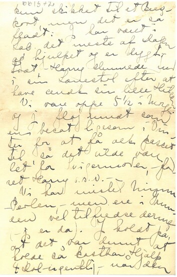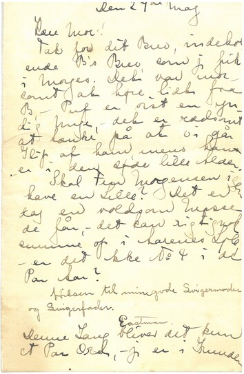 [Ellen Sawyers skrift:] Denne Gang bliver det kun et Par Ord, - jeg er i Grunden kun skikket til et Brevkort, men det er så fladt. Jeg har været i Lab. det meste af Dagen og hjulpet og er dygtig træt, - Harry slumrede ud i sin Lænestol efter at have sendt sin lille Hilsen.