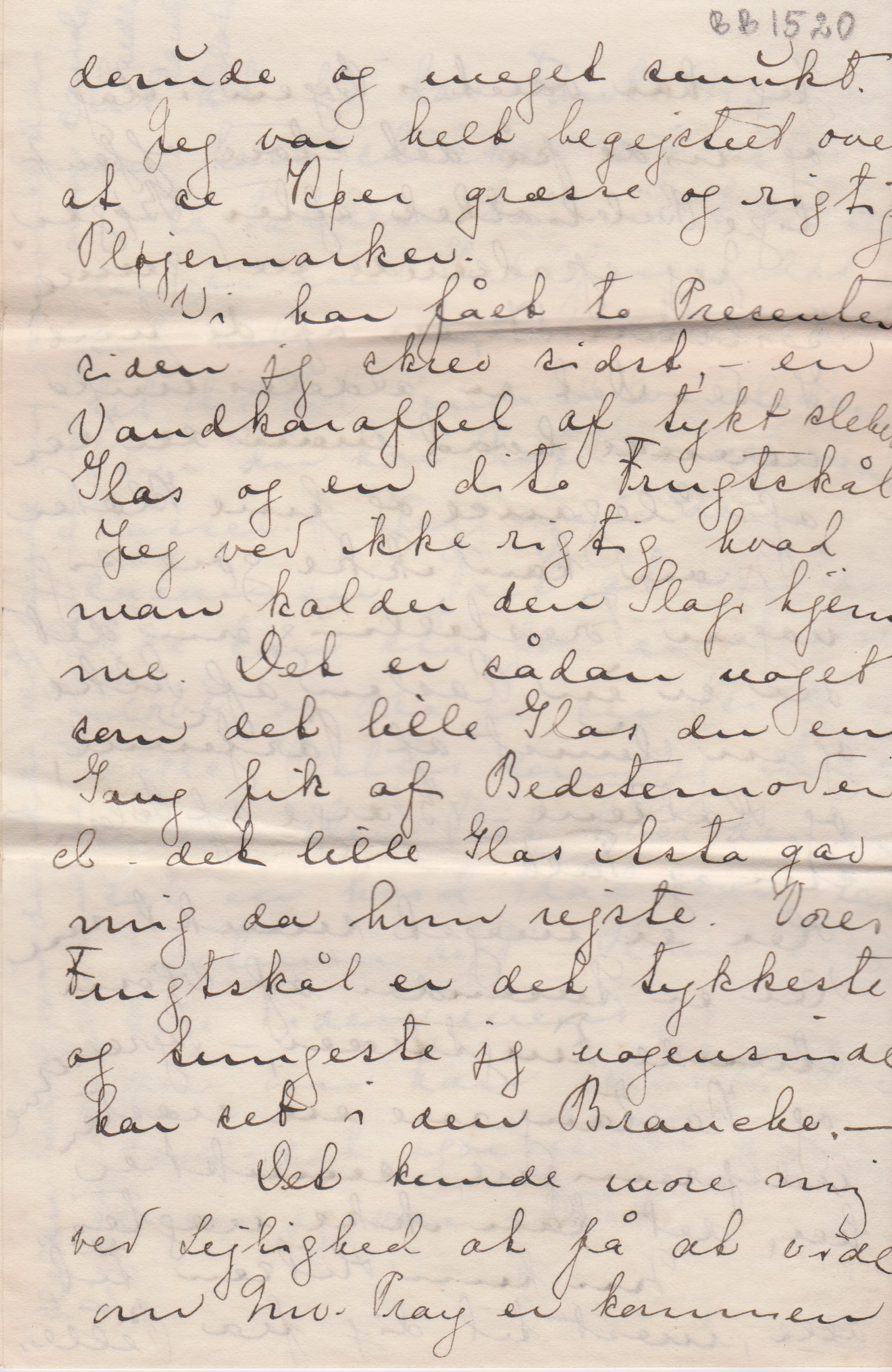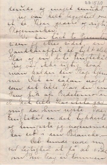 Vi har fået to Presenter siden jeg skrev sidst, - en Vandkaraffel af tykt slebet Glas og en dito Frugtskål. Jeg ved ikke rigtig hvad man kalder sådan den Slags hjemme. Det er sådan noget som det lille Glas du en Gang fik af Bedstemoder el – det lille Glas Asta gav mig da hun rejste. Vores Frugtskål er det tykkeste og tungeste jeg nogensinde har set i den Branche.-