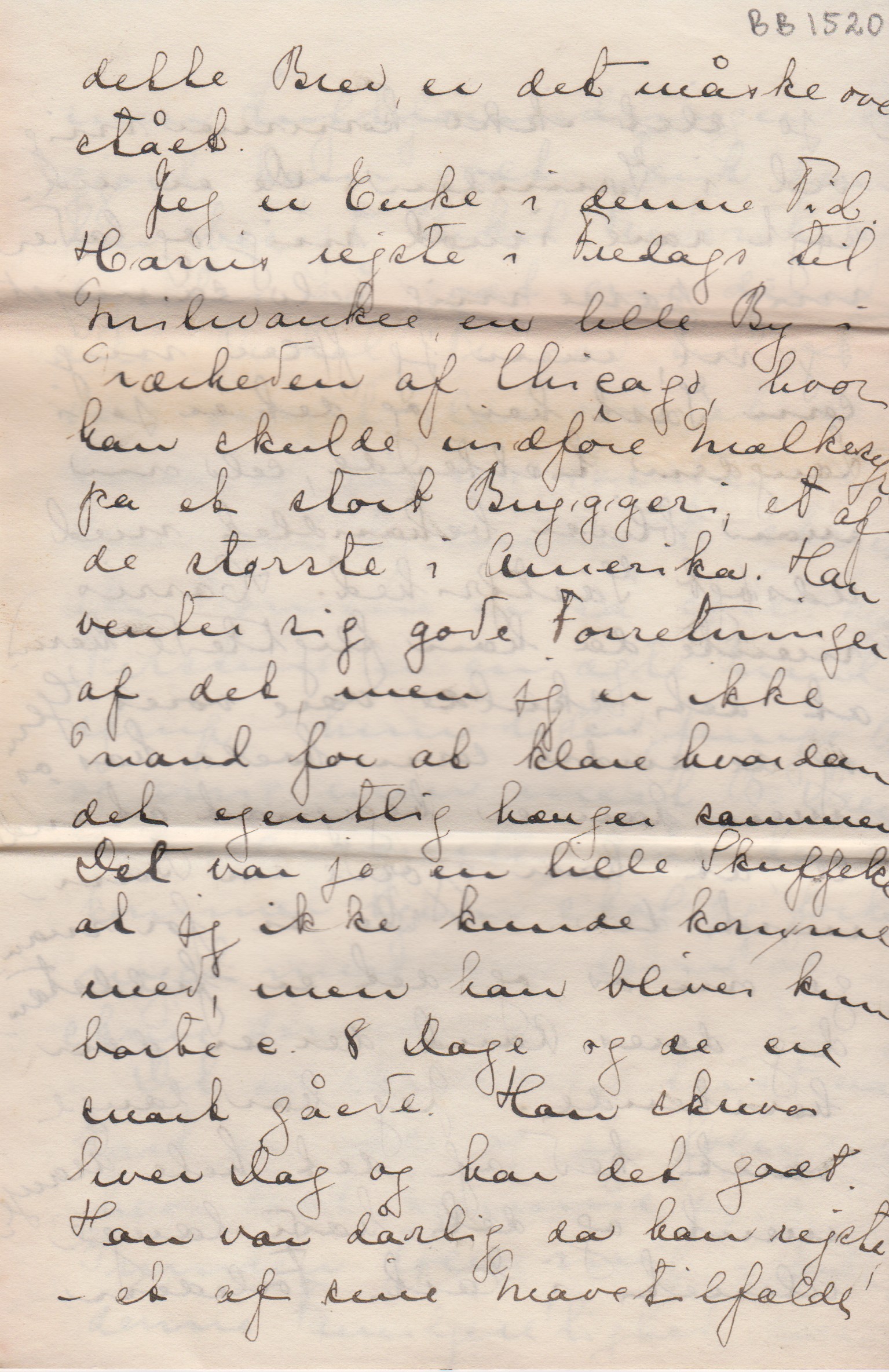 Jeg er Enke i denne Tid. Harris rejste i Fredags til Milwaukee, en lille By i Nærheden af Chicago, hvor han skulde indføre Mælkesyre på et stort Bryggeri, et af de største i Amerika. Han venter sig rigtig gode Forretninger af det, men jeg er ikke Mand for at klare hvordan det egentlig hænger sammen. Det var jo en lille Skuffelse, at jeg ikke kunde komme med, men han bliver kun borte c. 8 Dage og de ere snart gåede. Han skriver hver Dag og har det godt. Han var dårlig da han rejste, et af sine Mavetilfælde men Luftforandringen har gjort ham godt. Tænk han har besøgt Onkel Frederik og syntes så godt om dem alle. Onkel Fr. lod til at være meget glad over at se ham og få en Passiar med ham alt hjemme. E. skriver at Børnene er så søde. Mary Kirstine er en ægte Brandstrup, - hun ligner [”n” i "ligner" indsat over linien] Junge, B og mig men mest B. Drengen er allerkæreste. Når han kommer hjem skal jeg forklare meget mere om dem og skrive derom. –