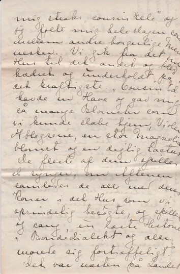 Det er skrækkelig trist når East er væk og jeg føler rigtig hvor lidt hjemme jeg i Grunden føler mig i hele denne Familjere'lighed, som jo slet ikke kommer mig ved i Grunden. De ere udsøgt rare imod mig og lader mig passe mig selv så meget jeg vil, men jeg føler mig som Gæst her og det er jo i Længden trættende, selv om man bliver behandlet med udsøgt Gæstfrihed. Harris mente da han flyttede herind at det skulde være vores Hjem og de andre som boede hos os, men han er begyndt at indse, at han gjorde en Bommert der. – De er for mange om os og det er fuldstændig deres Aand der er den herskende. Jeg har længe været ked af det hele Arrangement og det har længe ulmet i East. Forleden mig straks ”cousin Elle” og jeg følte mig hele Dagen som mellem andre borgerlige Mennesker. Vi gik fra det ene Hus til det andet og blev hædret og underholdt på det kraftigste. ”Cousin Ed” havde en stor Have og gav mig så mange Blomster som vi kunde slæbe hjem, Violer, Æblegrene, en stor Magnoliablomst og en dejlig Cactus. De fleste af dem spiller el synger, om Aftenen samledes de alle med deres Koner i det Hus, som vi oprindeligt besøgte og spillede og sang, èn læste Historier i Bondedialekt og alle morede sig fortræffeligt.