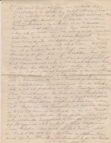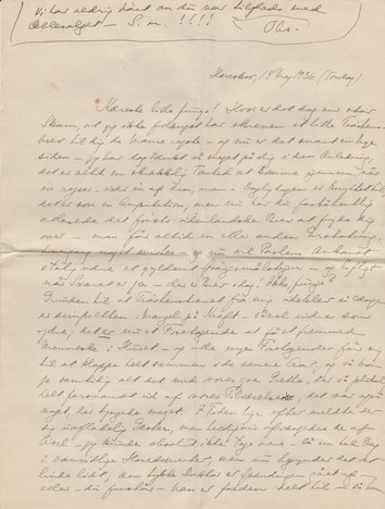 Kæreste lille Junge! Hvor er det dog en stor Skam, at jeg ikke for længst har skreven et lille Trøstensbrev til dig da Manse rejste – og nu er det snart en Uge siden – jeg har dog tænkt så meget på dig i den Anledning, det er altid en skrækkelig Tomhed at komme igennem, når én rejser – især én af dem, man i Dagligdagen er knyttet til, det er som en Amputation; men nu har du forhåbentlig allerede det første udenlandske Brev at fryde dig over – man får altid en eller anden Erstatning, hvergang noget mistes – og nu vil Postens Ankomst stadig være et gyldent Spørgsmålstegn – og lifligt når Svaret er ja – der er Brev i dag! Ikke Junge?
