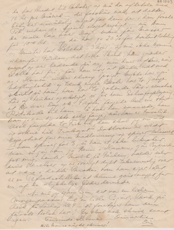 2/ ikke mere tynger mig Spor; han har købt sig Overålstøj - og hjælper mig troligt i Haven , hvor vi nu endelig er ved at få tilsået, det kneb i Aar med Kraften dertil; igår ordnede vi alle Grønsagsbedene - lagde Ærter, såede Gulerødder – Bønner – Salat etc – to hele Dage sled vi, men i Dag må jeg holde mig i Skindet og nusle indendørs. Men han vilde partout grave Grønjord – vi har fået Lov at dyrke Kartofler på [ulæseligt]ners Grund hernedenfor vores, ned mod Søen – det går han så og virker med det nu. Buf – som har røde Hunde og derfor ikke er på Fabrikken – kom for lidt siden; han, Nus og Trut virker på fuld Kraft på Glasmaleriet nede i Atelieret (som det nu kaldes) – du kan lige stole på, det er dejlige Ting – alle som ser det er yderst begejstrede og de har allerede solgt en Masse til private – hvad jo egentlig ikke er Meningen, da det er baseret på Butikssalg - men takket være Privatsalget har de stadig ikke nået at præstere et Lager (Prøvelager) til de store Forretninger. De brænder en Ovnfuld c hver 2-3die Dag, kun éngang er noget mislykkedes – og det blev strax solgt underhaanden uden Tab. Det er en hel Fornøjelse at komme derned og kigge til dem og se hvad de nu har lavet. Buf er en enestående Hjælp for dem – han er selv glødende begejstret og havde mest Lyst til at opgive alt andet og blive Kompagnon. Søren Madsen har med en flot Gestus ydet en Kredit på 100 Kr., idet han en Aften kom med herlige Glasting fra Holmegaard for det Beløb – de har Kredit til Oktober og må da afbetale med 10 Kr pr Måned – du forstår nok, at dette betyder umådeligt meget for dem her i den første Tid, inden de tjener noget rigtigt – nu kan de male løs hver dag – man får Masser for 100 Kr – og de har jo 20 % for kontant Betaling. - . Munter har Løbetid – 3 Uger – og må ikke komme udenfor Gården; det lille Skind, han græder meget og ser bedende på os; men hver Aften, når vi alle har fri, får han Lov at færdes lidt med os i Haven under streng Opsigt. Mibbe har også Udflugtstid og tænk, nogle Bæster har to Gange skudt på ham, han har to gabende Sår i venstre Lår og hinker ynkeligt, vi gir ham Extraforplejning, et Æg hver Dag, etc. I Aftes fangede Axel en stor Rødskade til ham – å, hvor han svansede; han kan jo nemlig ikke selv fange, når han er invalid. Axel fangede to Fisk til, dem skal jeg nu ud og ordne til Frokost. Doktoren er vildt begejstret for min Madlavning og spiser kolossalt – han spiser for 3 så han er ikke lukrativ. Men så gør han jo Gavn i Haven, går Byærinder for mig, henter Mælk på Gården, holder selv sine Værelser og er iøvrigt dybt taknemmelig over at være i dette Paradis, som han siger. Det er en Tilfredsstillelse at kunne gøre noget for de ulykkelige Jøder dernede.