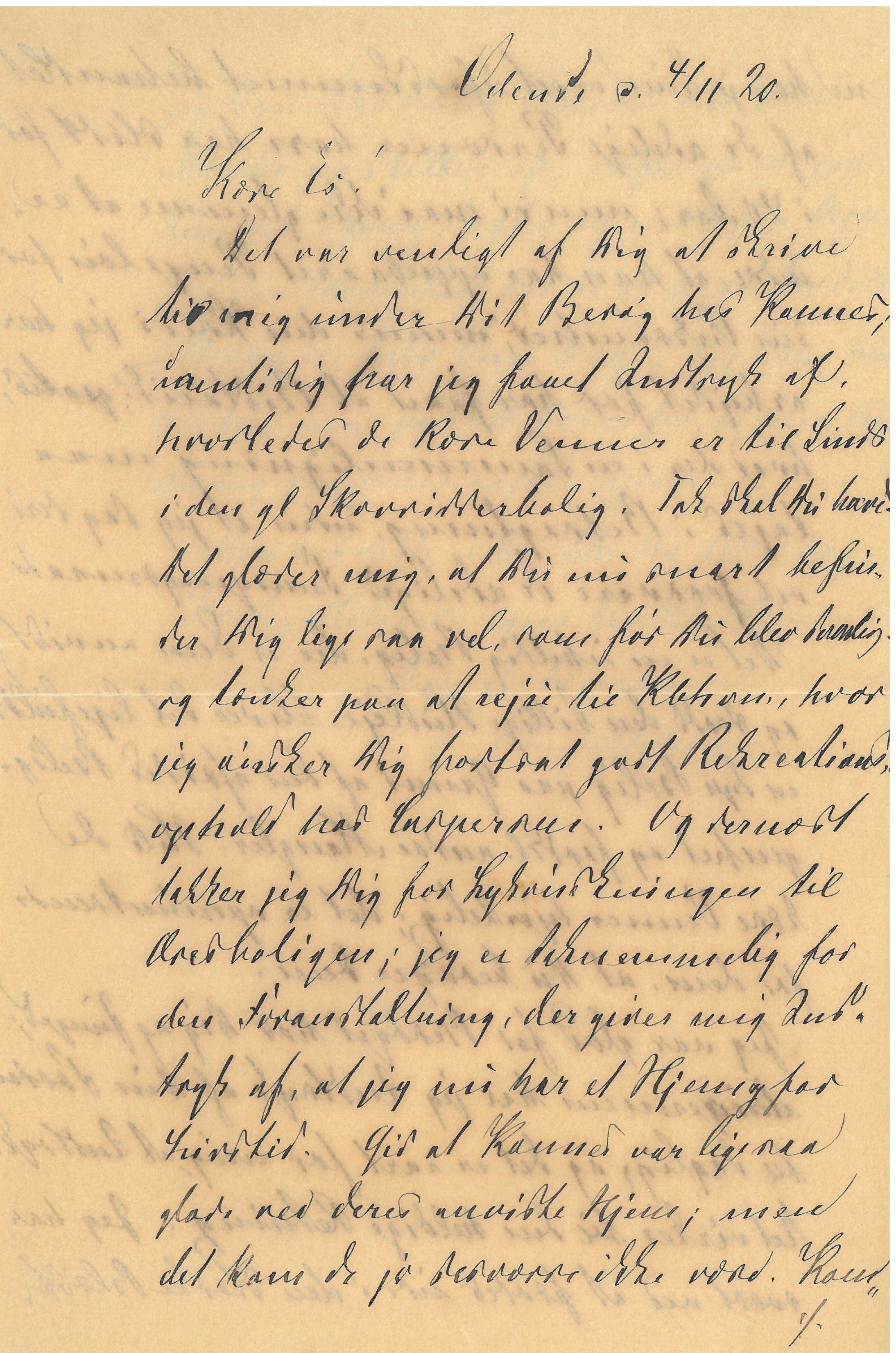 Det var venligt af Dig at skrive til mig under Dit Besøg hos Konnes; samtidig har jeg faaet Indtryk af, hvorledes de kære Venner er til Sinds i den gl Skovriderbolig. Tak skal Du have! Det glæder mig at Du nu snart befinder Dig lige saa vel, som før Du blev [ulæseligt ord] og tænker paa at rejse til Kbhvn, hvor jeg ønsker Dig fortsat godt Rekreationsophold hos Caspersens. Og dernæst takker jeg Dig for Lykønskningen til Æresboligen; jeg er taknemmelig for den Foranstaltning, der giver mig Indtryk af, at jeg nu har et Hjem for Livstid. Gid at Konnes var ligesaa glade ved deres anviste Hjem; men det kan de jo desværre ikke være. Konne har jo kun været uforskammet behandlet af de adelige Personer han har slidt for i 40 Aar; men vi maa ikke glemme at erindre, at han har oppebaaret Pengeløn for sin Virksomhed, medens den Kreds jeg har arbejdet for har faaet al Bistand gratis, hvad der i Sammenligning maa tages i Betragtning, uden at jeg dog heri vil forsvare de adeliges Fremgangsmaade.
