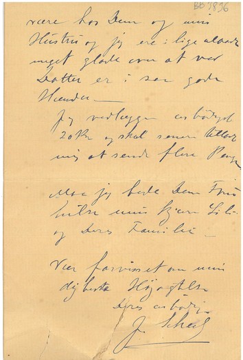 Jeg vedlægger ærbødigst 20 Kr og skal senere tillade mig at sende flere Penge.
