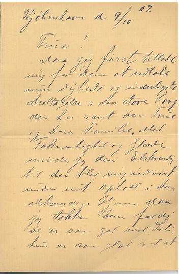 Maa jeg først tillade mig for Dem at udtale min dybeste og inderligste Deltagelse i den store Sorg der har ramt Dem Frue og Deres Familie. Med Taknemmelighed og Glæde mindes jeg den Elskværdiged der blev mig udvist under mit Ophold i deres elskværdige Hjem. Maa jeg takke Dem fordi De er saa god mod Lili, hun er saa glad ved at være hos Dem og min Hustru og jeg ere i lige Maade meget glade over at vor Datter er i saa gode Hænder -