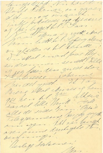 Tante blev til Mandag og var rask. Jeg har moret mig mere end en Gang ved at læse Langemann; hvor er dog Tipperary morsom! Mon jeg dog takkede Madien eftertrykkeligt nok! Jeg har en Følelse af, at mine Taksigelser har været saa ufuldkomne! Jeg skriver og skriver hver Dag; er snart færdig med alle Takkebreve. Jeg har haft det udmærket hele Tiden, er i Gaar begyndt at gaae Tur, skjøndt Knuden paa Benet ikke er helt væk, men generer mig ikke. Grethe fik af Ville Fibiger 2 Kr. og en nydelig Naal med 3 smaa Stene; Tante vil sende hende en Manicureæske. - Nu læser jeg [ulæseligt ord] med Erik og han gør sig glimrende Umage med alt; han spiser Middag her. - Hvor Dagene længes dejligt! Nu bare den korte Februar, saa gaaer det mod Foraaret. - Putte forkølede sig desværre og har ligget til i Gaar. Naar Thora er rask, skal hun lidt til Syberg alene; vi glæder os til hende. Du skal snart faae Kejserdrammen sendt; Elle og jeg læser den med stor Interesse. - Johanne har det godt. - Et Par Breve skal skrives og bringes hen til 3_20_, altsaa Farvel lille Muk! Hils alle de søde Børn! Ogsaa Telegrammerne har jeg nydt om igen. Alt var langt over mine dristigste Forventninger!