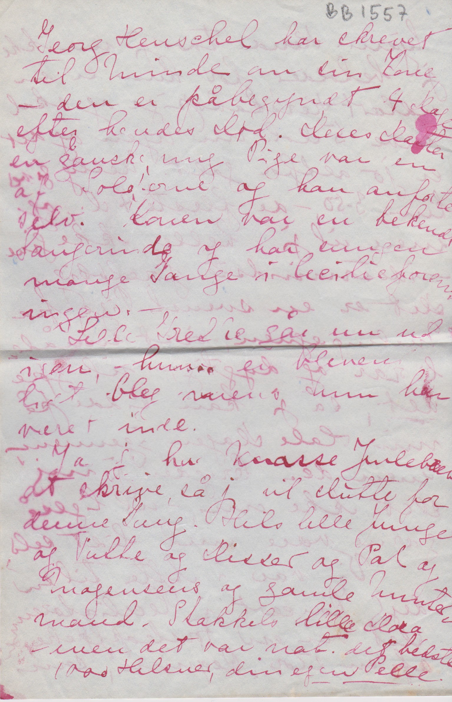 Ja jeg har Masser Julebreve at skrive, så jeg vil slutte for denne Gang. Hils lille Junge og Tutte og Disser og Pal og Mogensens og gamle Muntermand. Stakkels lille Dora – men det var nok det bedste.