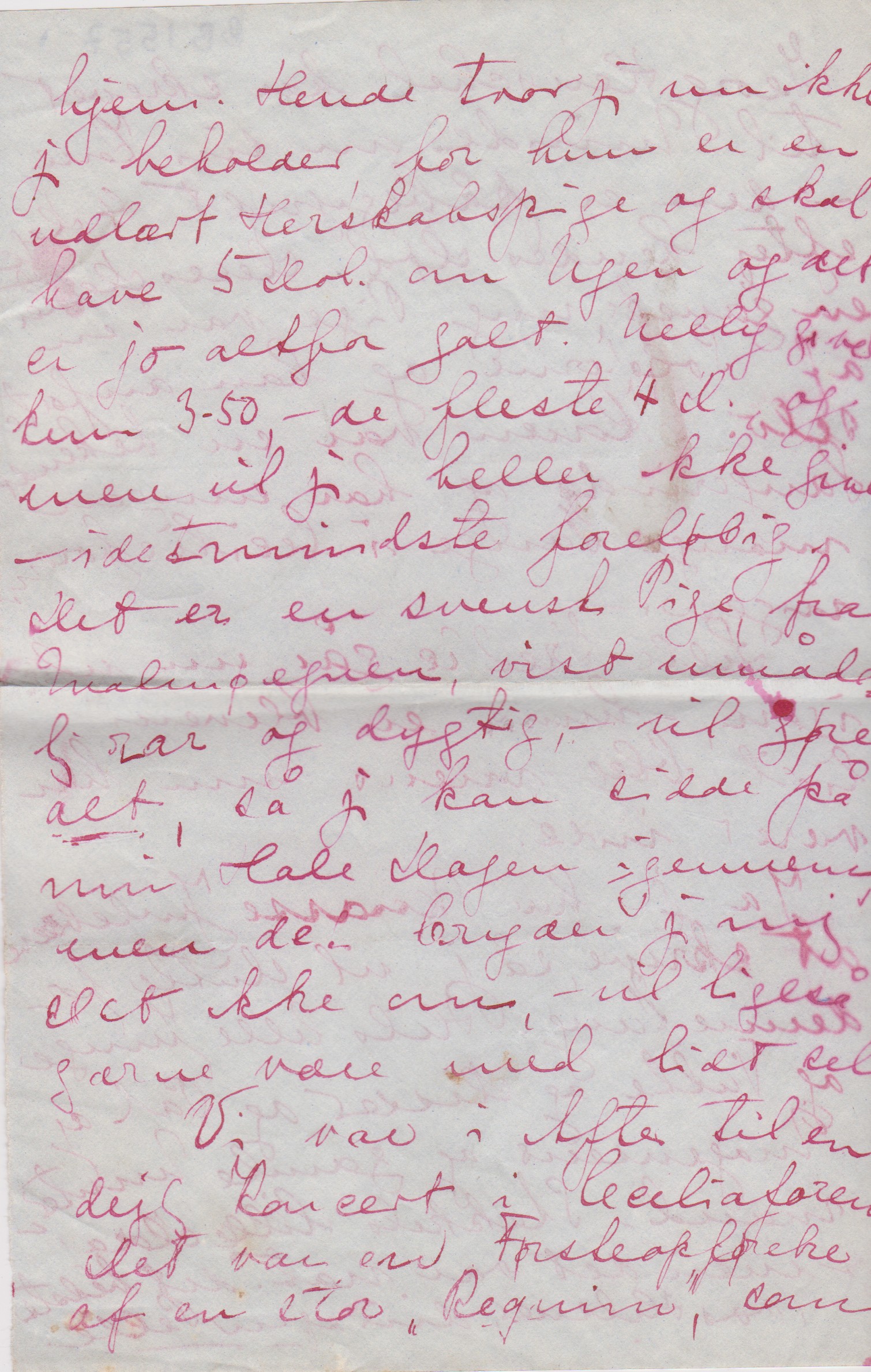 Vi var i Aftes til en dejlig Koncert i Ceciliaforeningen Det var en Førsteopførelse af en stor ”Requiem”, som Georg Henschel har skrevet til Minde om sin Kone – den er påbegyndt 4 Dage efter hendes Død. Deres Datter en ganske, ung Pige var en af Solisterne og han anførte selv. Konen var en bekendt Sangerinde og har sungen mange Gange i Ceciliaforeningen. –