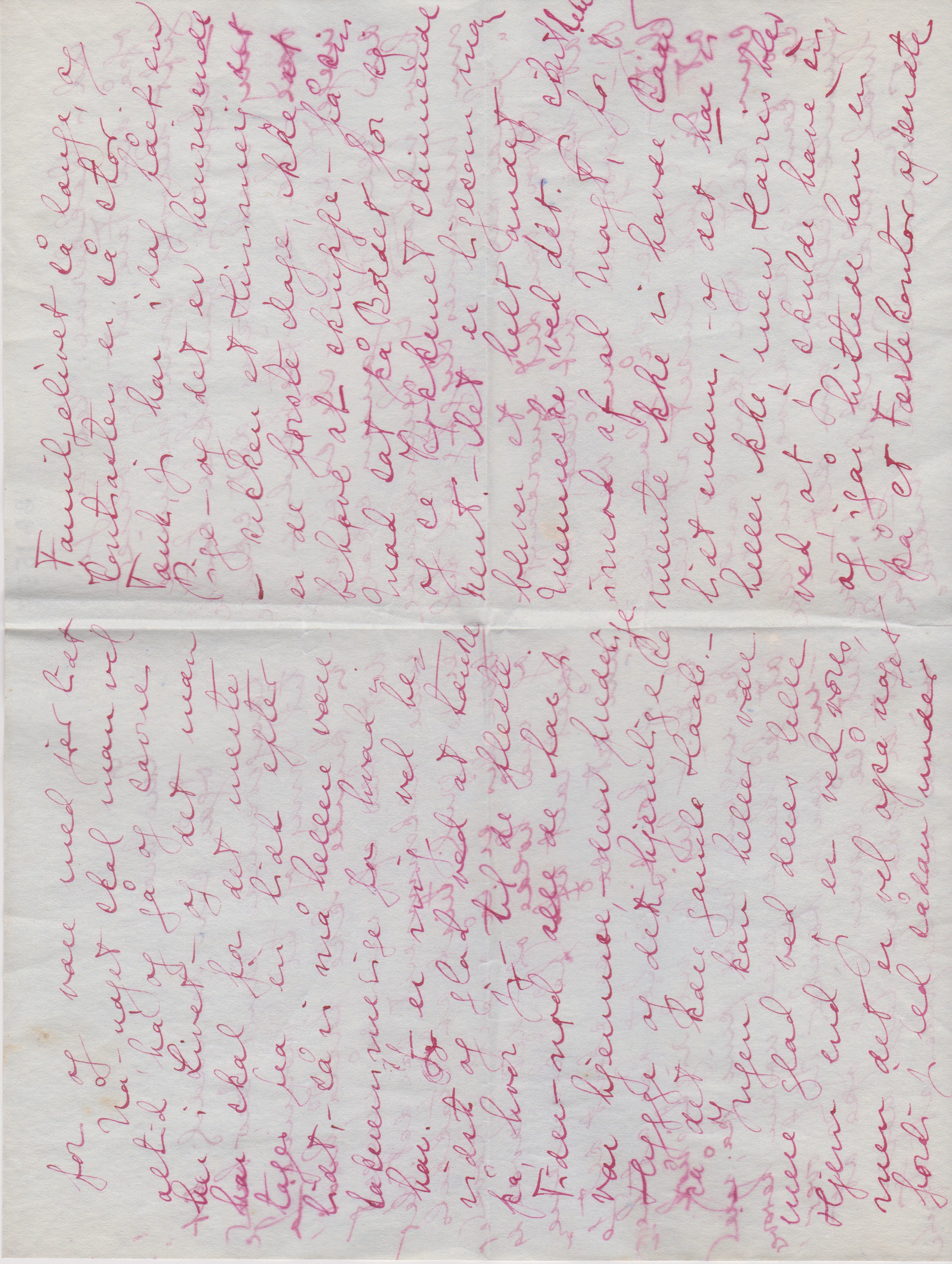 Igår kom da endelig dit længeventede Brev baade til mig og til Mornine. Ja, vi kunde ikke forstå, hvor det blev af, men så meget mere velkomment var det. Det er jo grulig trist at stakkels Dis er så dårlig i Hovedet og må holde op – det havde da været rart af at få Eksamenen, når det er så nær, skønt det i og for sig intet har at betyde. – Nej, jeg vil rigtignok på ingen Måde pine på, med at få hende eller nogen herover – nu når jeg tænker rigtig over det, så synes jeg jo også at det er synd at tage nogen nu, da det begynder at tynde ud i Rækkerne. Der er jo også den Fare, at de bliver gift herovre som Mornine, – skønt jeg kan ikke tænke mig, med hvem det skulde være, - for de giftefærdige ere meget sjældne. De siger at den lille Frk. Jansen skal have udtalt sig beundrende om Mornines Dygtighed til ”finde dem”.