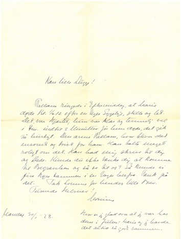Pallam ringede i Eftermiddag, at Marie døde Kl. 1/2 12 efter en Uges Sygeleje, stille og let. Det var Hjærtet; hun var klar og temmelig vel i Fm. indtil 2 Minutter før hun døde, det gik så hurtigt. Men arme Pallam, hvor bliver det ensomt og trist for ham. Han talte meget roligt om det. Han bad mig skrive til dig og Dede. Kunde du ikke tænke dig at komme til Begravelsen og så se til os? Så kunde vi fire køre sammen i en Vogn herfra. Tænk på det. Tak Lomme for hendes lille Brev.